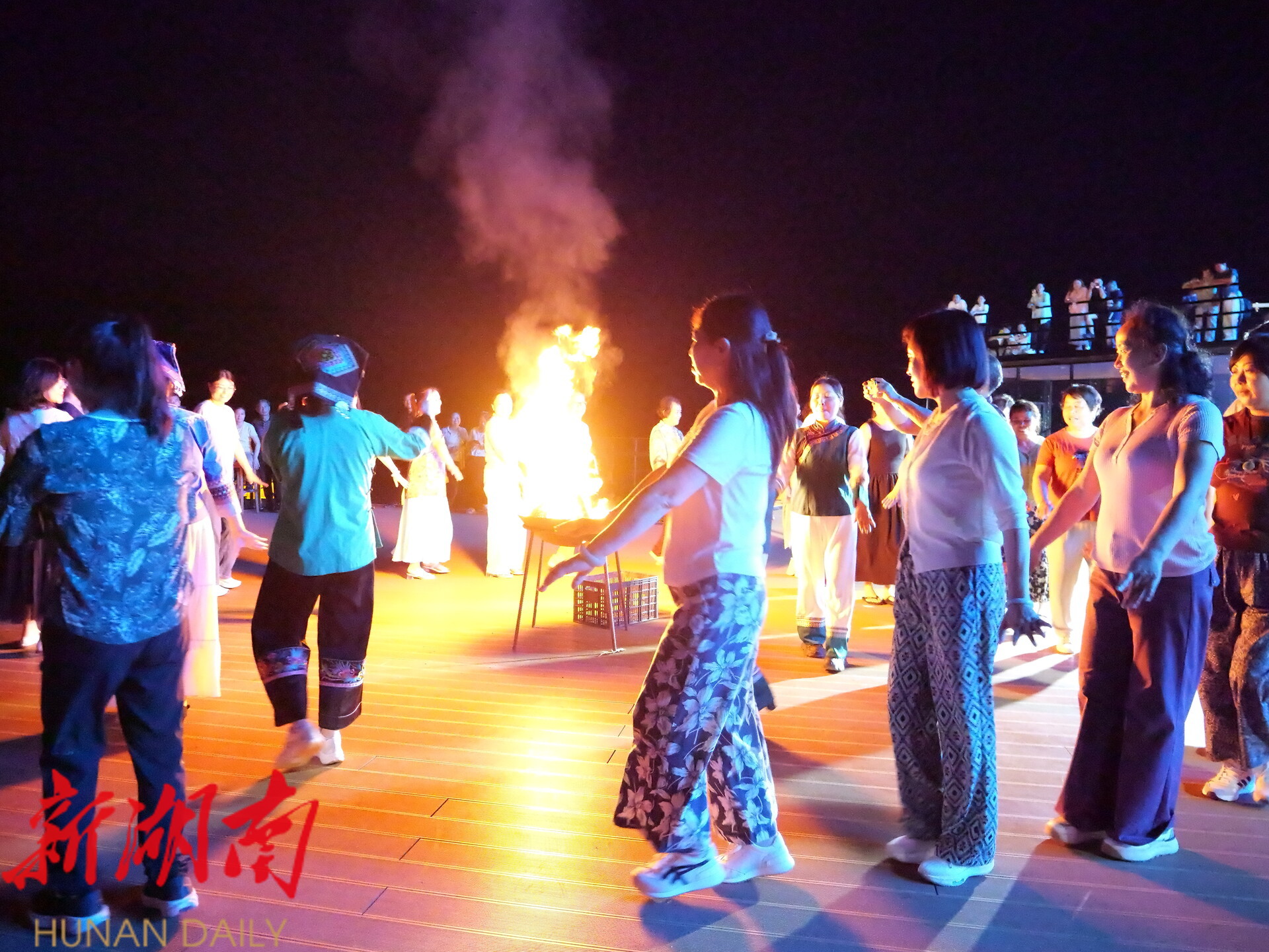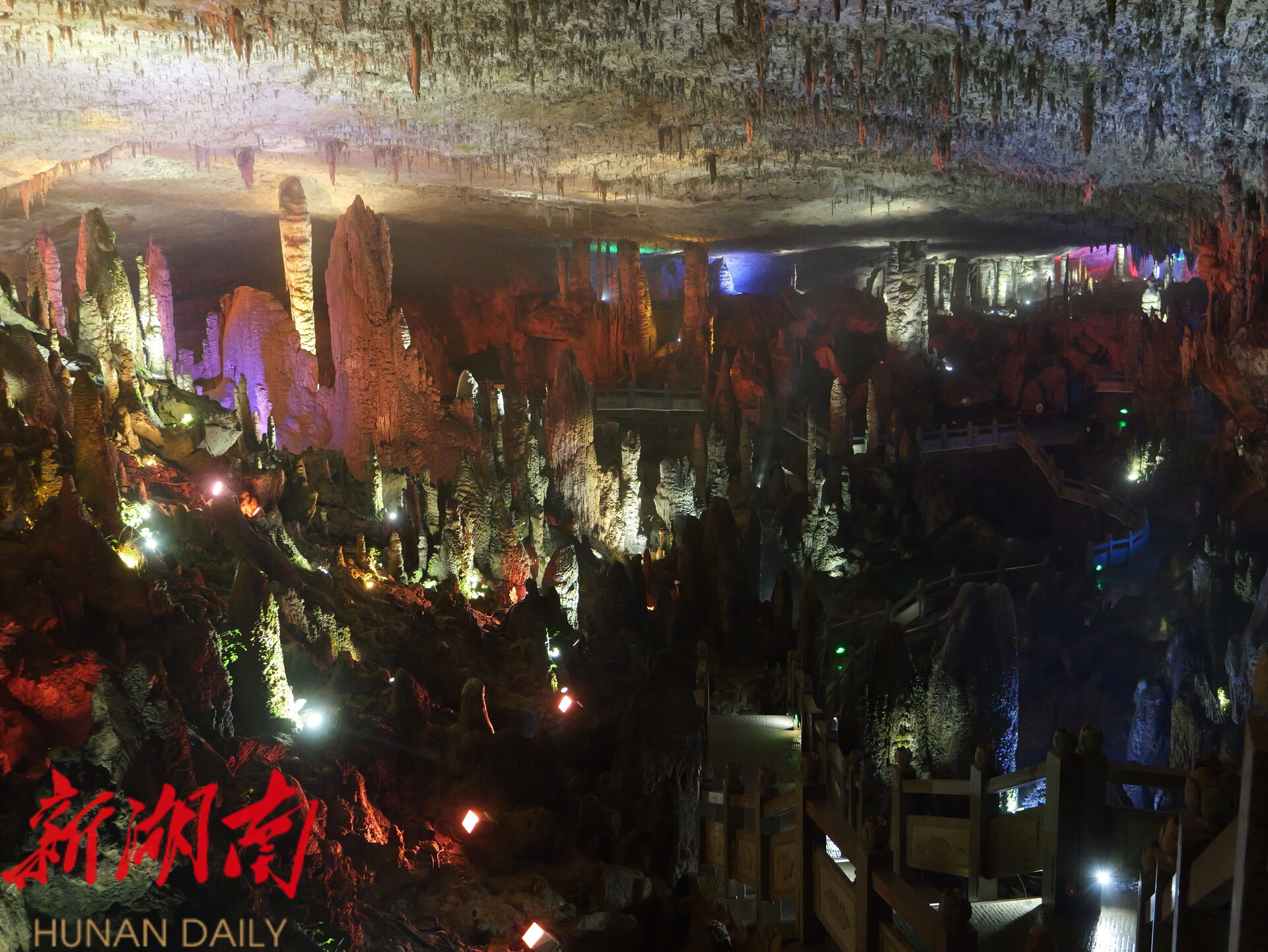 在“亚洲第一洞”的九天洞,千姿百态的钟乳石群与光影交织的溶洞奇观令采风团惊叹:“这里像是被时间凝固的异世界!”夜幕低垂,采风团成员来到文旅综合体阿巴砦景区,热情参与篝火晚会,共跳摆手舞、学唱桑植民歌……深度体验当地原生态民族风情。