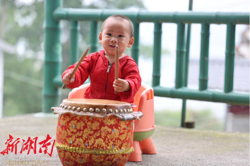 古丈县龙舟代表队划手王李华的儿子在练习打鼓