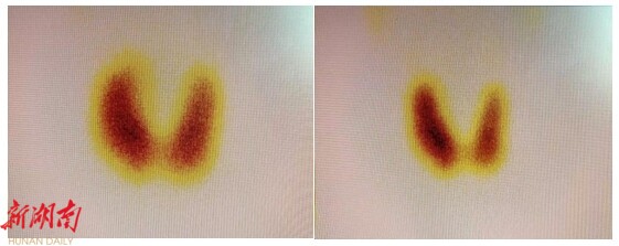 △甲状腺显像图,治疗前(左),治疗后(右)