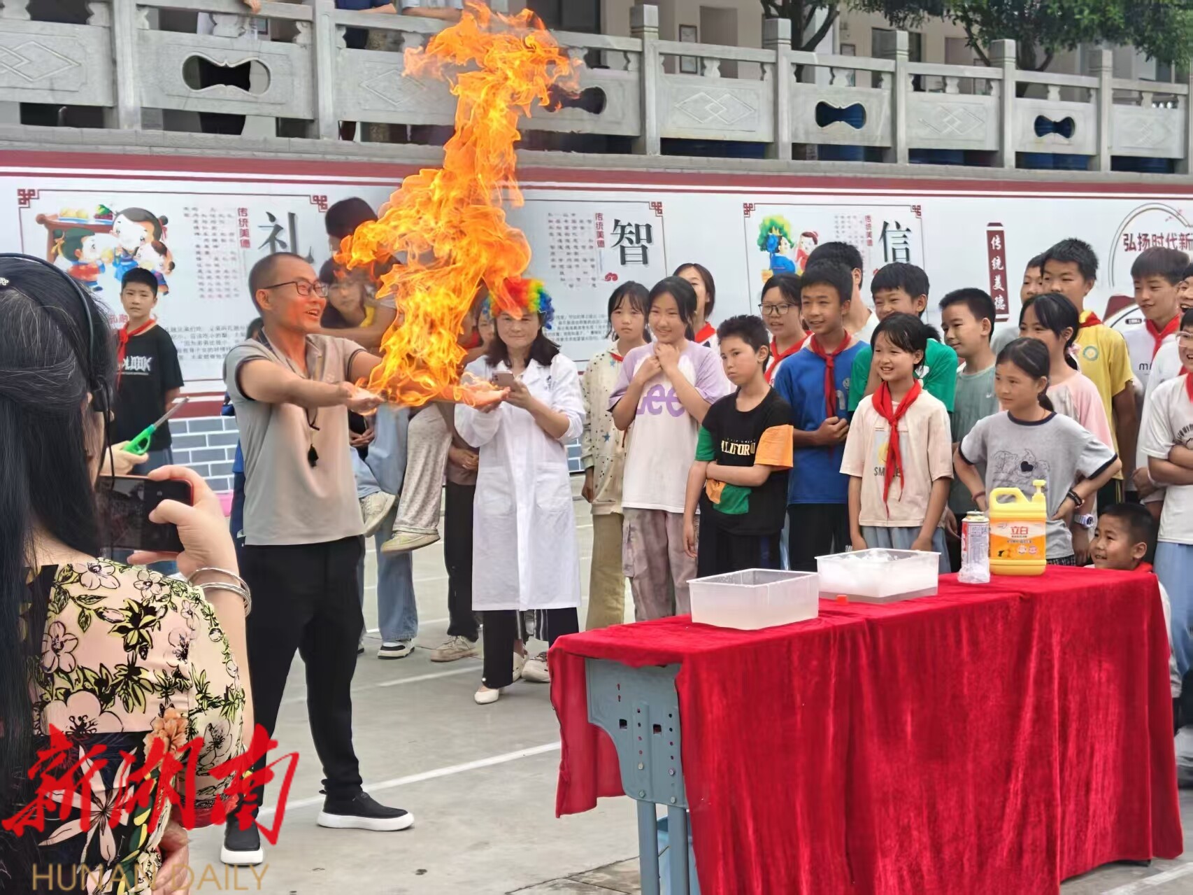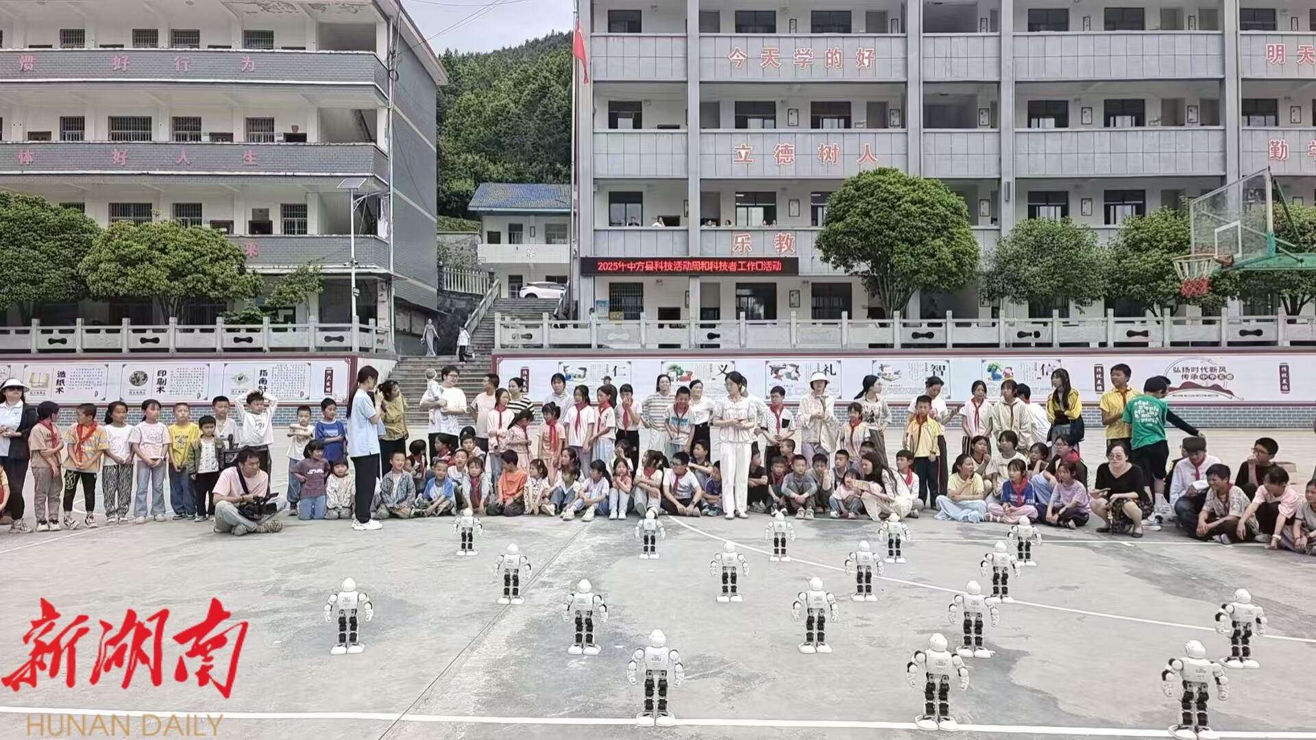 此次活动以“科技赋能发展 创新引领未来”为主题,通过丰富多彩的科普展演与互动,激发青少年科学兴趣,传播科普知识,提升创新意识。 在科普展演活动中,科技与艺术的融合成为最大亮点,“湘科普四进活动”志愿者(长沙科迪尔教育科普师)通过“掌中火焰”安全实验与“干冰秀”低温奇观,用趣味实验揭开科学的神秘面纱。怀化市科技馆带来的智能机器人舞蹈表演,以精准的舞步和动感的音乐展现了人工智能的魅力,学生与机器人共舞,现场充满欢声笑语。此外,憨态可掬的机器狗互动环节吸引全场目光,学生们与机器狗握手、对话、完成指令任务,近距离感受前沿科技的应用场景。在学校还同步开设了科普大课堂,通过生动的讲解引导学生探索森林与生物多样性的奥秘,科普老师带来的各种丛林生物吸引了孩子们层层围观。