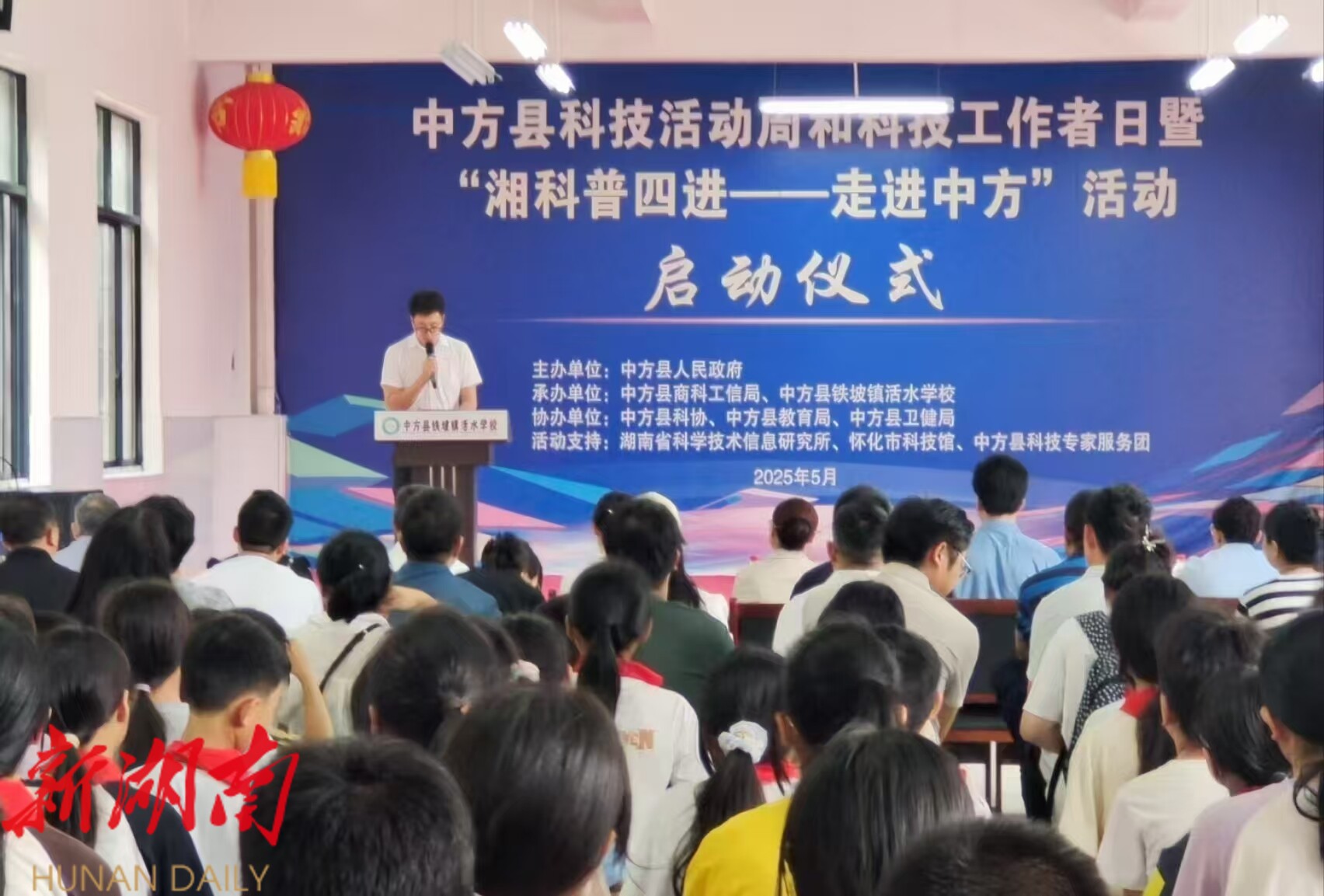 中方融媒5月22日讯 (记者: 王子豪 通讯员:杨勇 曾嘉琪 ) 5月22日上午,2025年中方县科技活动周和科技工作者日活动暨“湘科普四进——走进中方”启动仪式在中方县铁坡镇活水学校举行。启动仪式特邀而来的嘉宾有省市派遣的部分科技人才、“湘科普‘四进’活动”志愿者、怀化职业技术学院科普小分队、市科技馆科普小分队、中方慷复医院医务工作者等,县商科工信局、县科协、县教育局、县卫健局、铁坡镇政府等相关单位负责人及活水学校全体师生参加。
