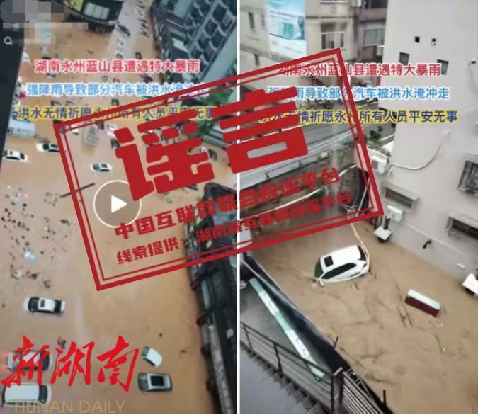 详情: 近期,多地持续遭遇强降雨天气,汛情动态牵动社会各界目光。然而,部分网民却借此编造与降水、极端天气相关的不实信息,并在网上传播。“湖南永州蓝山县遭遇特大暴雨,强降雨导致部分汽车被洪水淹冲走”“强降雨导致福建南平建瓯房道镇路面进水”“乌鲁木齐南山板房沟,暴雨山洪”以及“阿勒泰地区气象台预计25日夜间至27日夜间,将出现大范围大风和强寒潮天气”等网传信息,均引发较多关注。经湖南永州、福建南平、新疆乌鲁木齐、新疆阿勒泰四地相关部门核查证实,上述信息均与实际情况不符,确为谣言。网信、公安提醒:对编造散布极端天气谣言,扰乱公共秩序的行为,将依法依规严肃查处。请广大网民擦亮眼睛,以气象部门发布的信息为准,勿轻信、勿传播非正规来源或未经证实的信息。(来源:“湖南省互联网举报中心”微信公众号、“福建辟谣”微信公众号、“新疆网络辟谣”微信公众号)