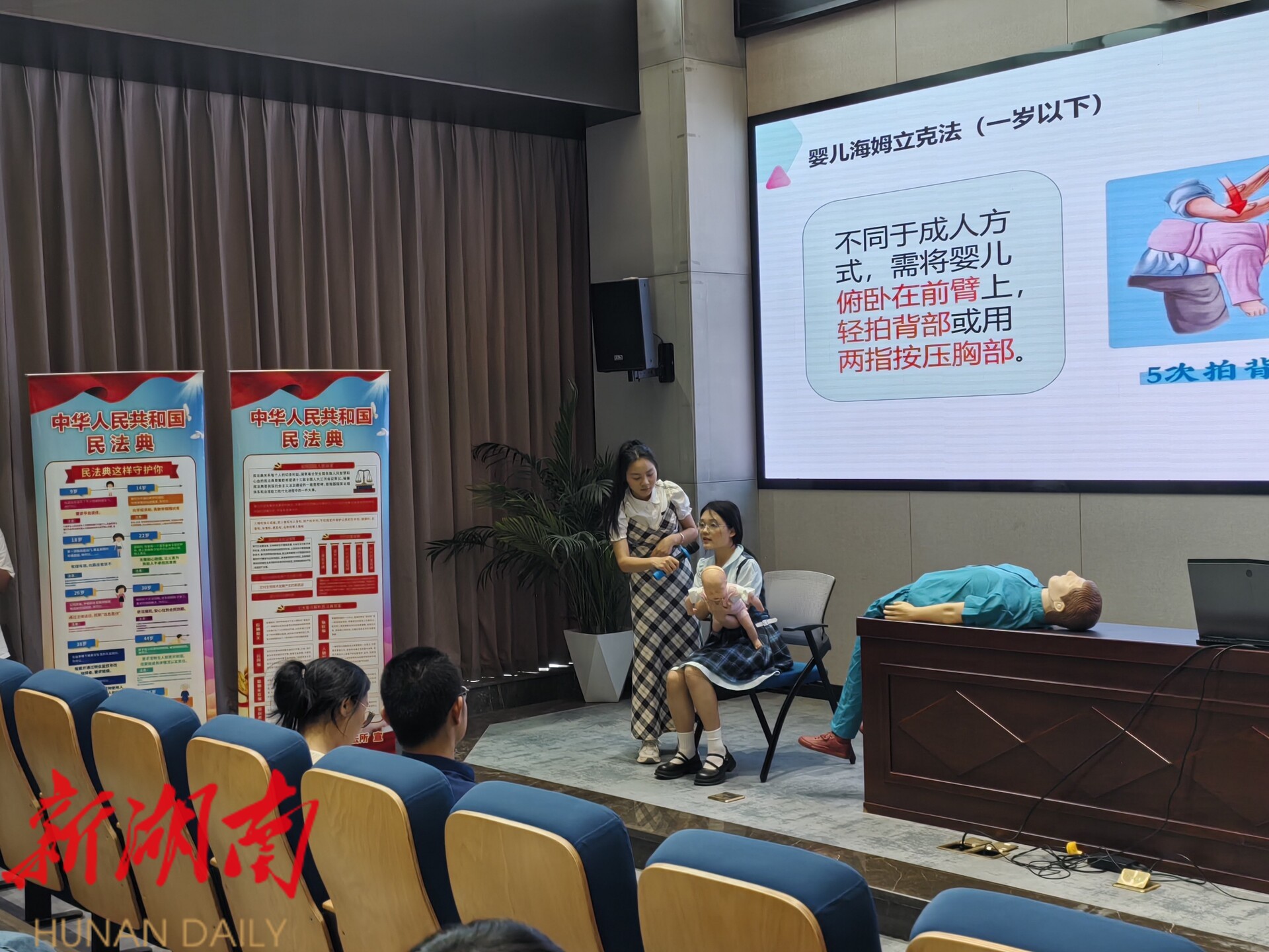 湖南日报·新湖南客户端5月22日讯(通讯员 周佳)为提升青年企业职工安全意识与应急能力,保障企业安全生产和职工生命健康,5月22日下午,由共青团长沙学院委员会、共青团开福区委员会、月湖街道党工委联合主办,鸭子铺社区承办的“长大有志青年·应急知识宣讲”主题活动在马栏山创意中心大厦顺利举行。活动面向湖南省建筑科学研究院有限责任公司等多家企业近90名员工,通过理论教学与实操演练相结合的方式,为青年职工们送上一场实用的生命健康知识培训。