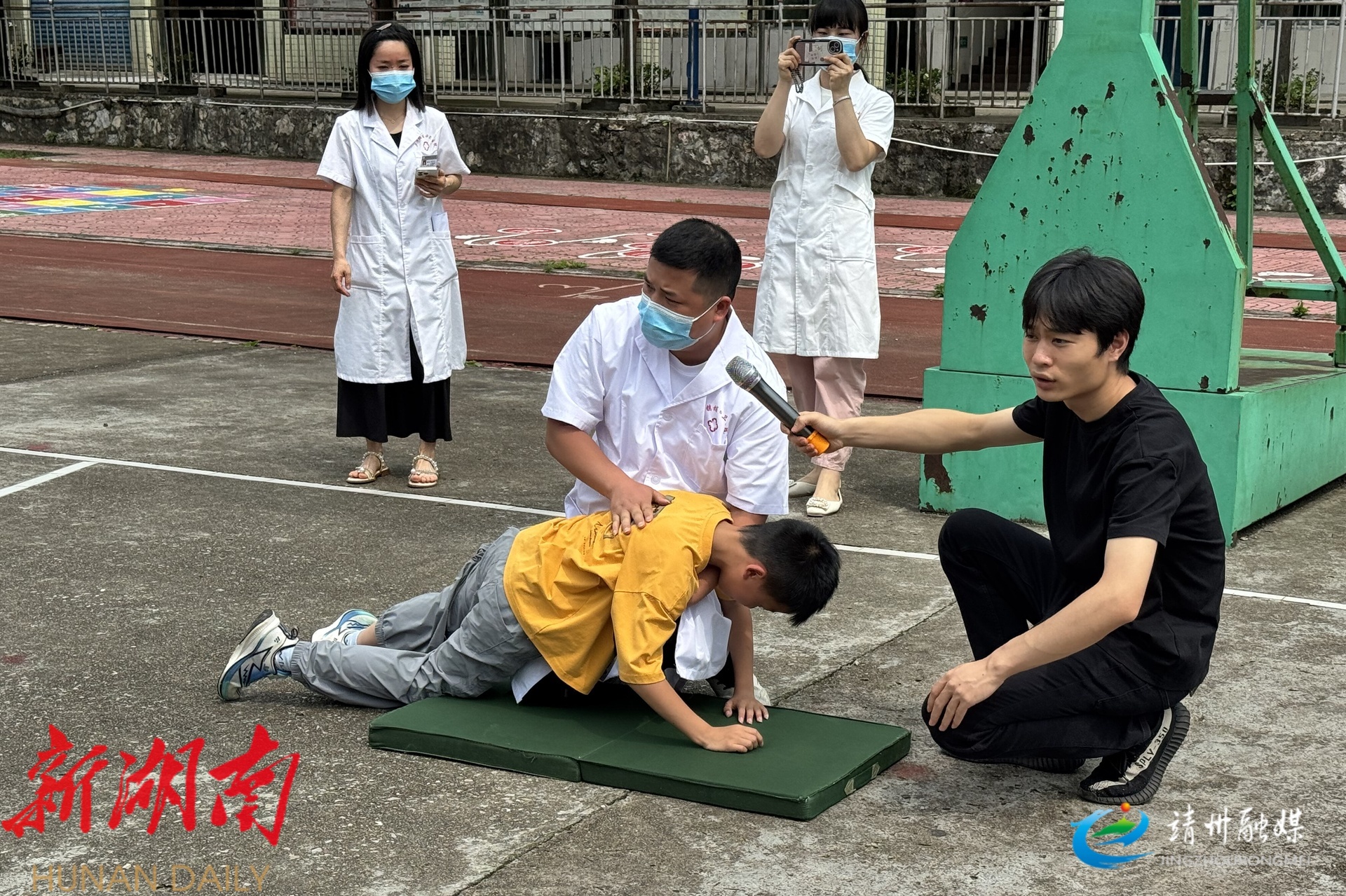 医护人员给飞山小学学生现场讲解溺水救助的方式 (储双林 摄)