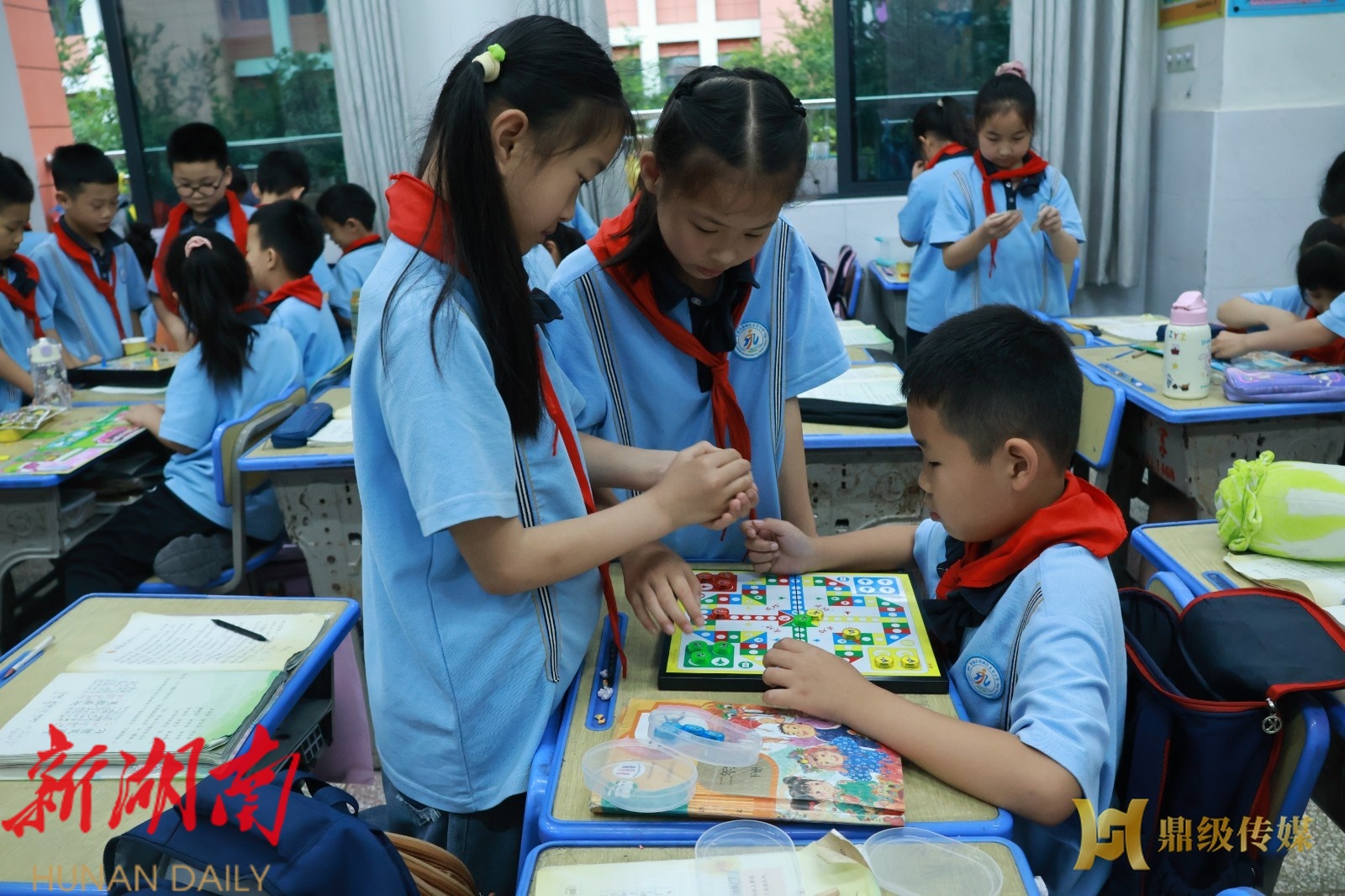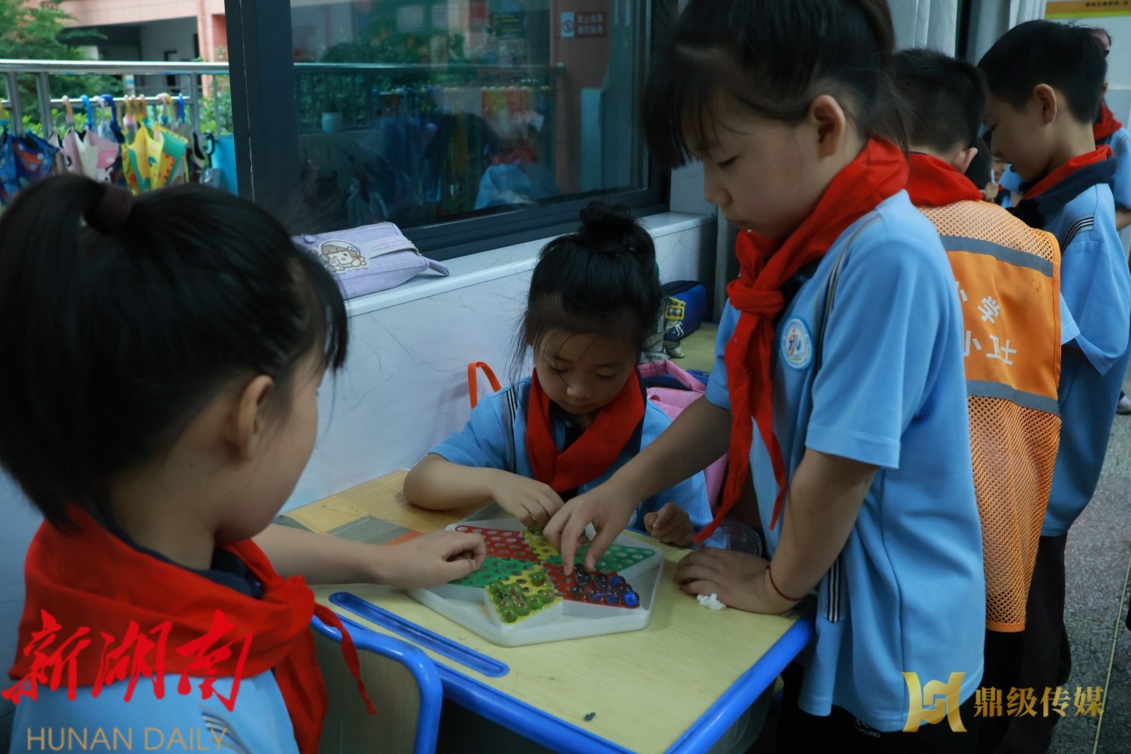 随着下课铃声响起,各班迅速有序地开展特色活动。操场上,篮球、乒乓球、羽毛球处处可见孩子们矫健的身姿,欢呼声呐喊声此起彼伏。教学楼走廊里,传统游戏、自制游戏、跳绳等活动精彩纷呈。教室里有的班级组织“诗词飞花令”快问快答,在知识碰撞中放松身心;有的班级用彩色卡纸开展“即兴折纸挑战”,现场充满思维火花与欢笑声;有的班级开展各种棋类活动,多样的棋盘将课间酿成了智慧碰撞的狂欢。