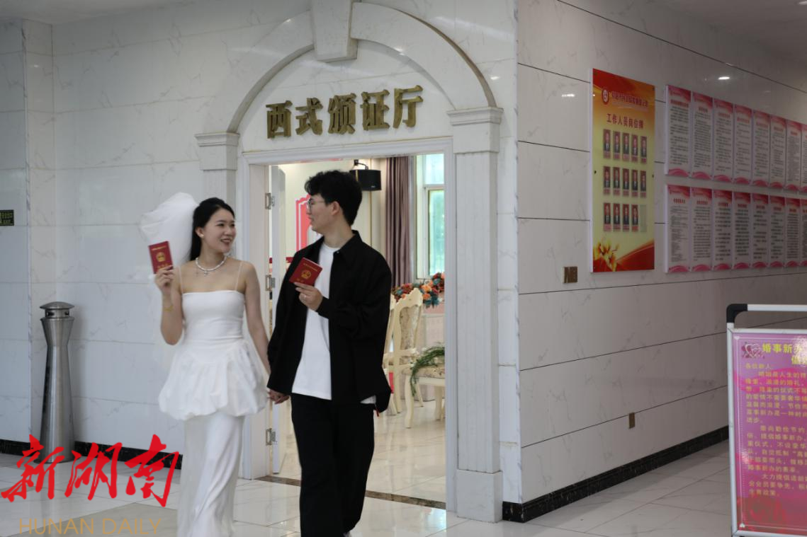 今年5月10日起施行的新《婚姻登记条例》首次实现婚姻登记“全国通办”,取消户口簿强制要求,简化办理流程。祁阳市民政局提前组织全员培训,精准落实政策要求。来自江西的新人刘先生夫妇在完成登记后感慨:“原本计划回老家办手续,没想到在祁阳10分钟就领到了‘红本本’,服务效率让我们特别惊喜!”