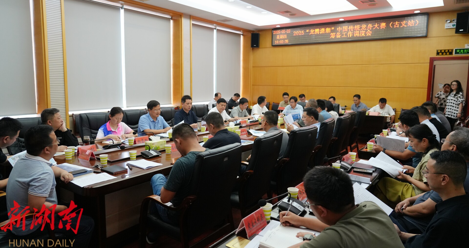 新湖南客户端5月23日讯(通讯员 郑湘)5月22日,湘西土家族苗族自治州古丈县委书记滕朝辉主持召开2025“龙腾潇湘”中国传统龙舟大赛(古丈站)筹备工作调度会。他强调,要坚定信心、振奋精神,锚定“安全、精彩、高效、节俭”办赛目标,高标准高质量做好赛事筹备工作,确保办成一届“安全有序、特色鲜明、有影响力”的文化体育盛会。