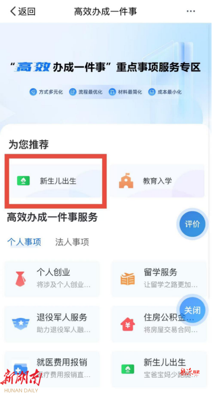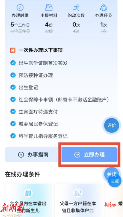 2、申请办理: 点击“高效办成一件事”专区中的“新生儿出生”主题区,通过智能导办页面提出立即办理申请。