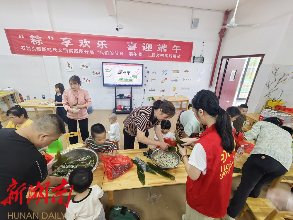 湖南日报·新湖南客户端5月23日讯(通讯员 蒋晴 谢培轩)临近端午,为弘扬中华优秀传统文化,石岩头镇新时代文明实践所联合镇中心幼儿园举办了“‘粽’享欢乐 喜迎端午”文明实践主题活动,通过亲子互动、趣味实践等形式,让幼儿、家长、教师及志愿者共同感受端午节的独特魅力。