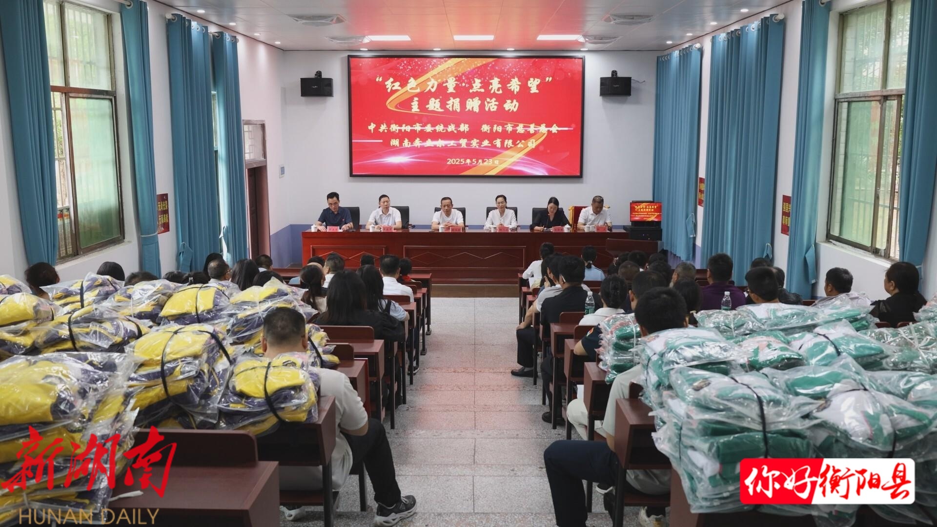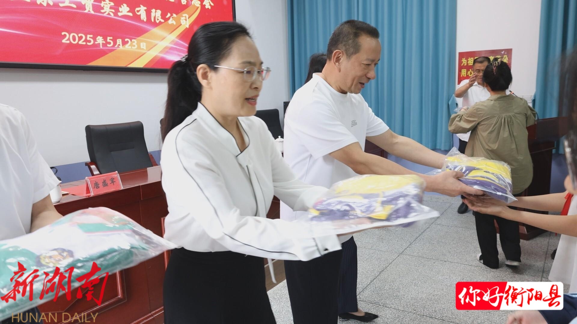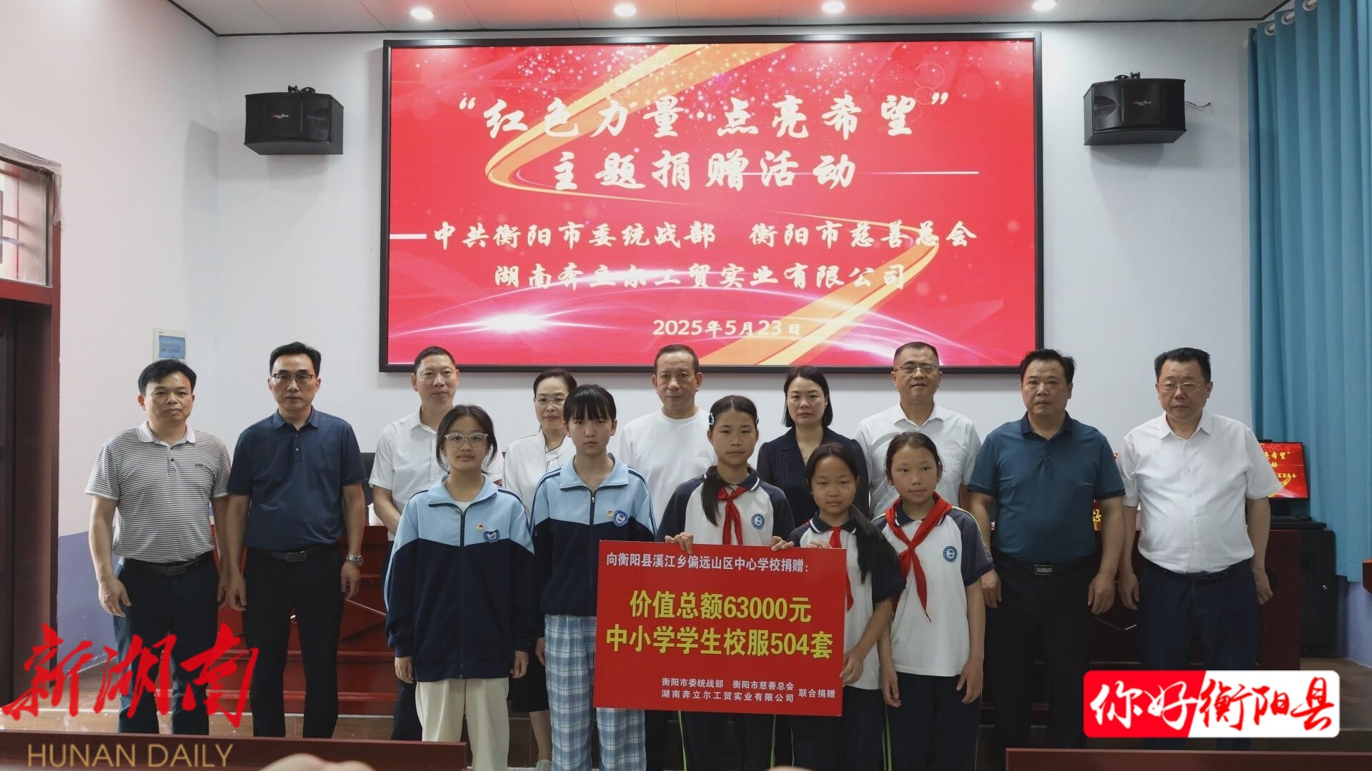 衡阳县融媒5月23日讯(记者:张兴宇 ) 5月23日,市委统战部、市慈善总会联合湖南奔立尔教育产业集团来到溪江乡,开展“红色力量·点亮希望”主题捐赠活动,为溪江中学和溪江中心小学捐赠爱心校服504套。