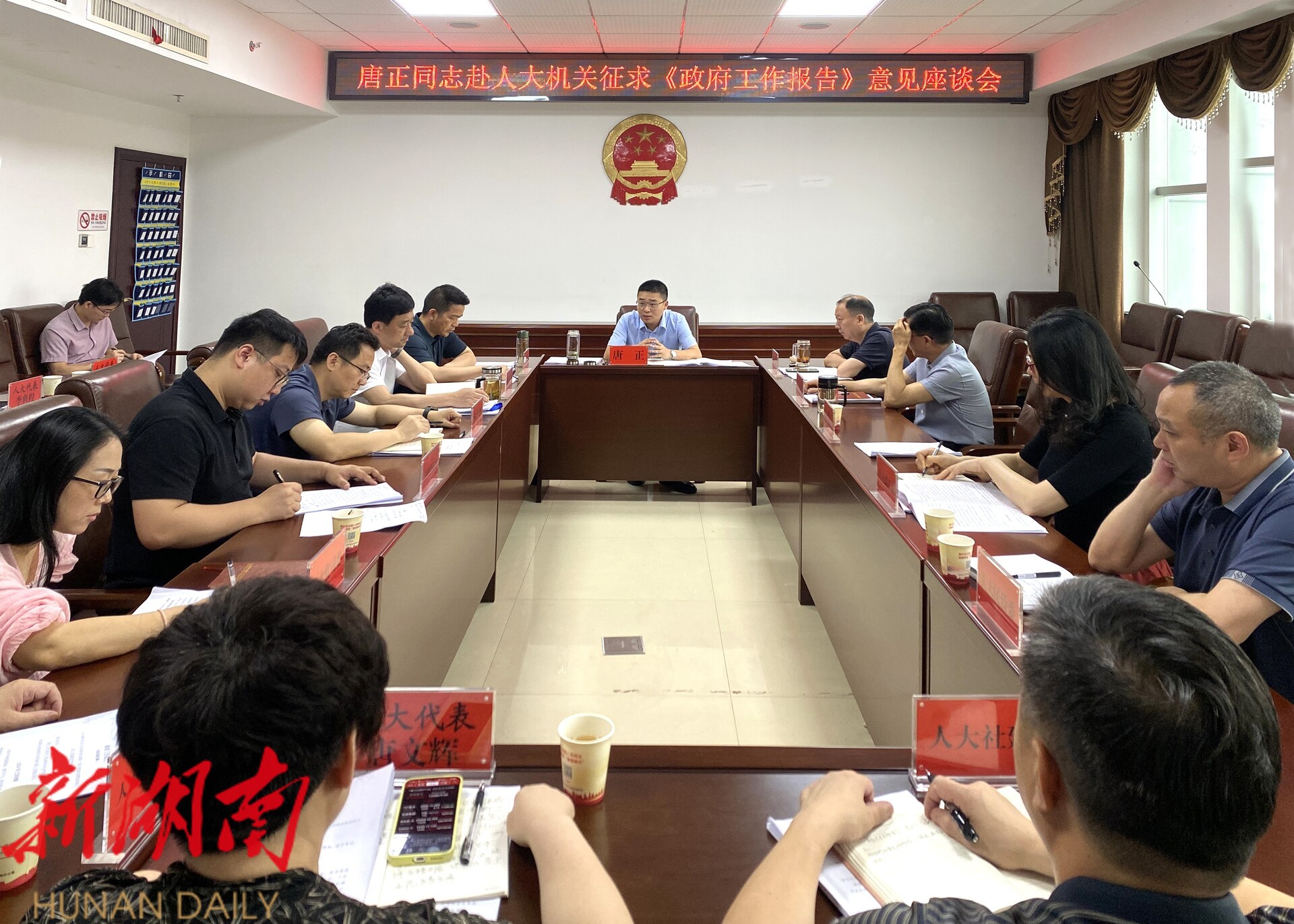 湖南日报·新湖南客户端5月23日讯(通讯员 段姝)23日,冷水江市委副书记、代市长唐正率队赴市人大常委会机关,就《政府工作报告》广泛征求意见建议。市人大常委会主任孙纬辉主持座谈会。