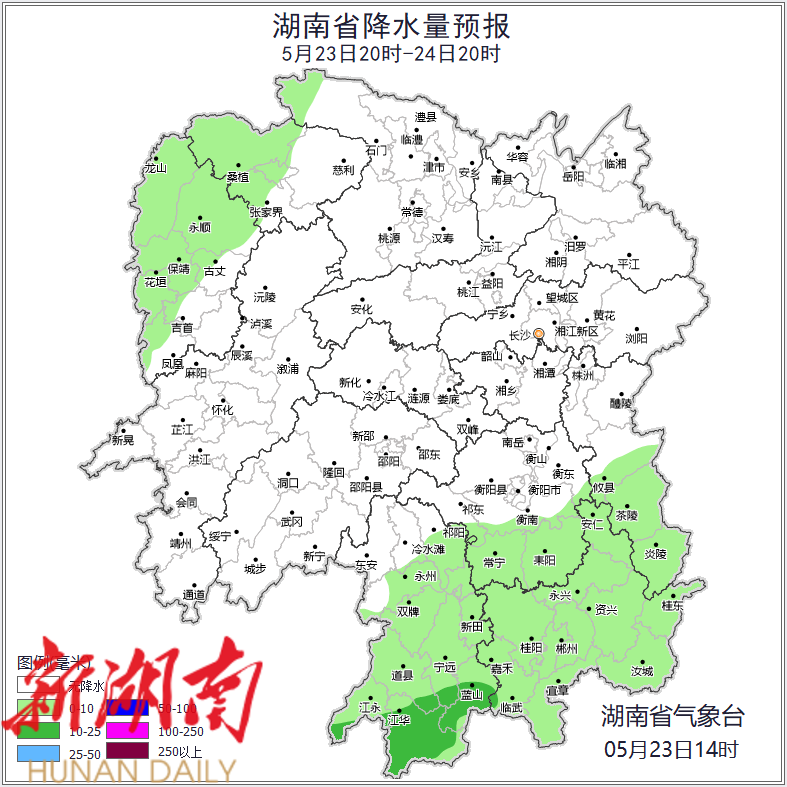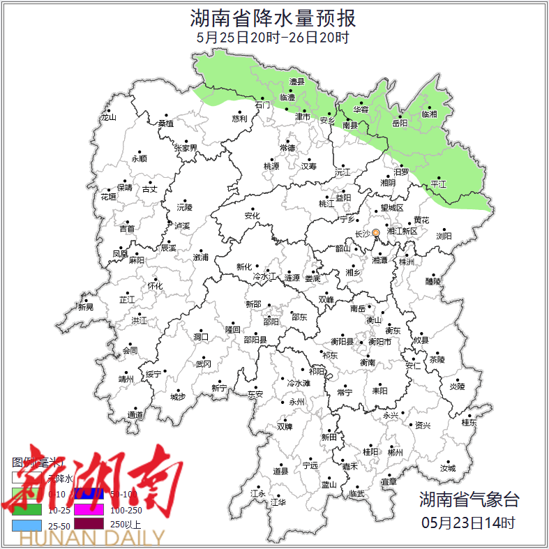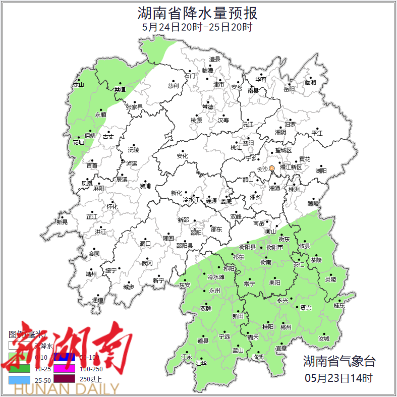 25日晚上至26日白天, 多云间晴天,其中湘北局地有阵雨,湘西、湘北清晨 有雾 ;南风2~3级;最高气温20~24℃,最低气温15~18℃。
