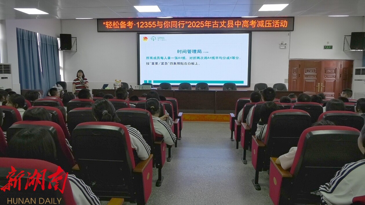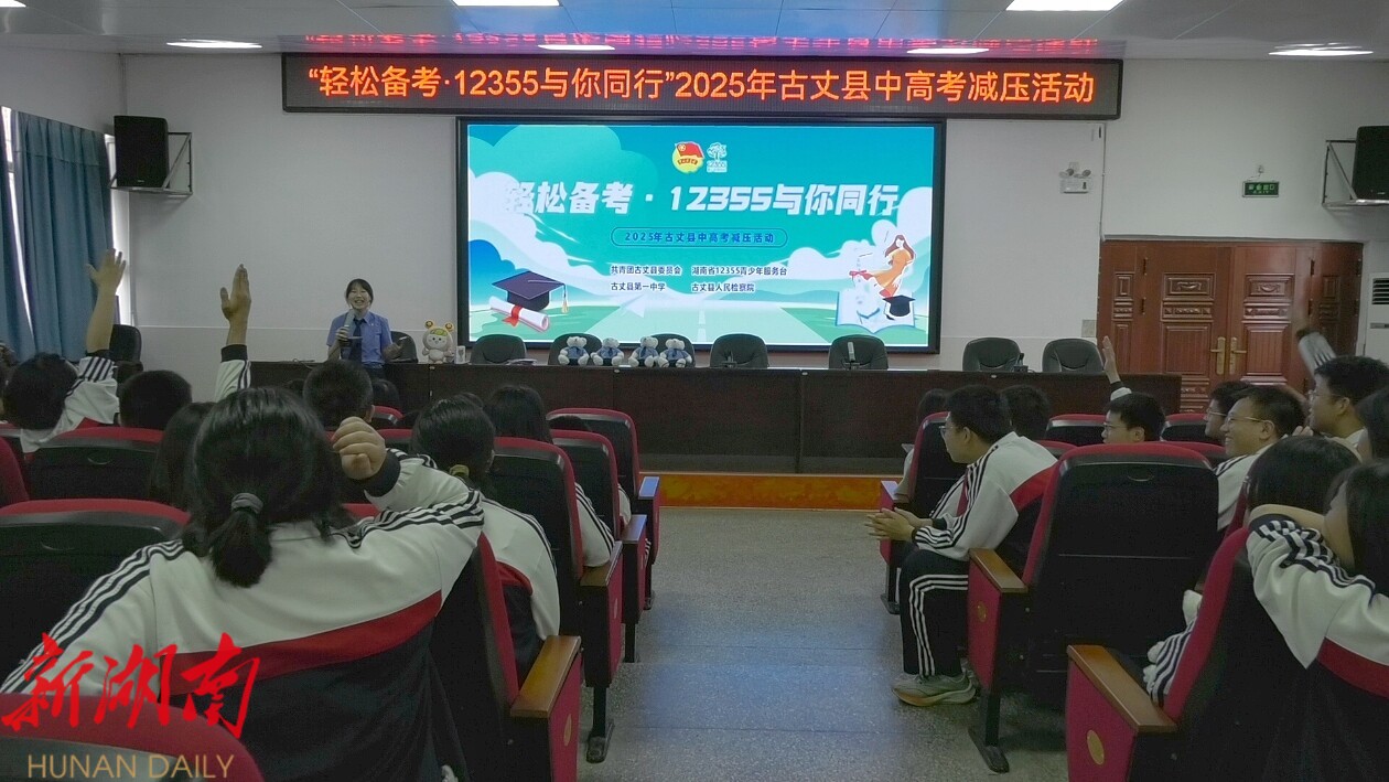 新湖南客户端5月24日讯(通讯员 余思颖)为帮助即将迎战高考的学子缓解备考压力,增强心理调适能力,同时提升青少年法治意识,5月23日,共青团古丈县委员会联合湖南省12355青少年服务台及县检察院,在古丈县第一中学共同举办“轻松备考·12355与你同行”2025年中高考减压活动。活动通过心理辅导、趣味互动与普法教育相结合的形式,为全校高三学生送上了一份别样的“备考礼包”。