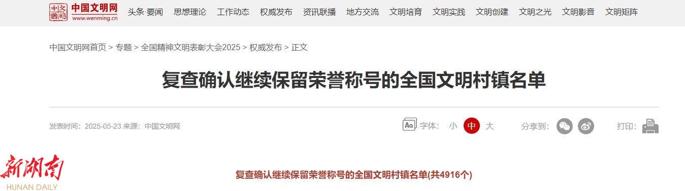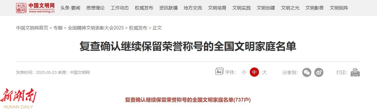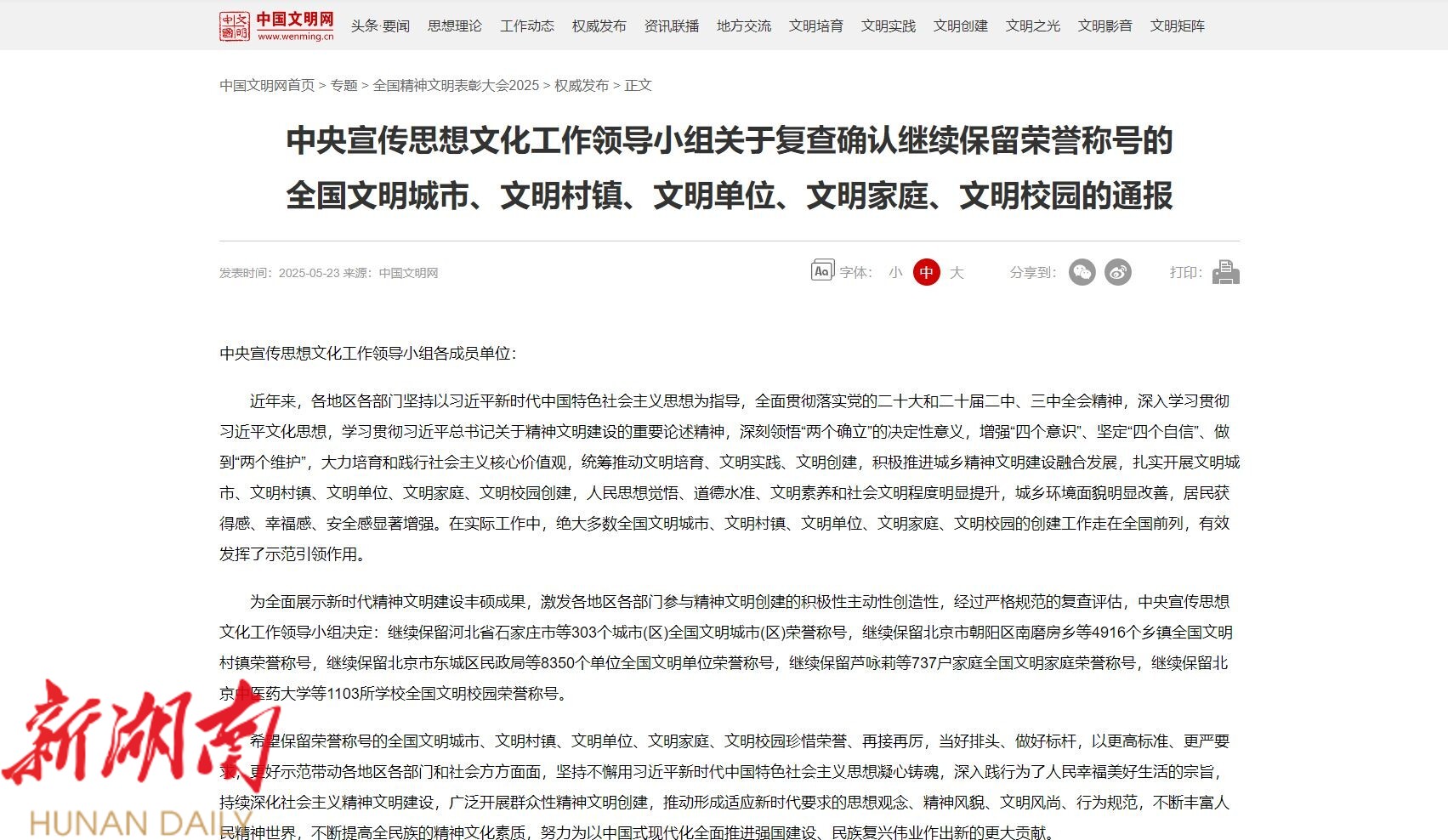 湖南日报·新湖南客户端5月24日讯 5月23日,中国文明网发布了《中央宣传思想文化工作领导小组关于复查确认继续保留荣誉称号的全国文明城市、文明村镇、文明单位、文明家庭、文明校园的通报》。桑植县五道水镇桑植坪村、马合口白族乡梭子丘村和李世友家庭经复查确认,继续保留全国文明村镇荣誉称号、全国文明家庭荣誉称号。