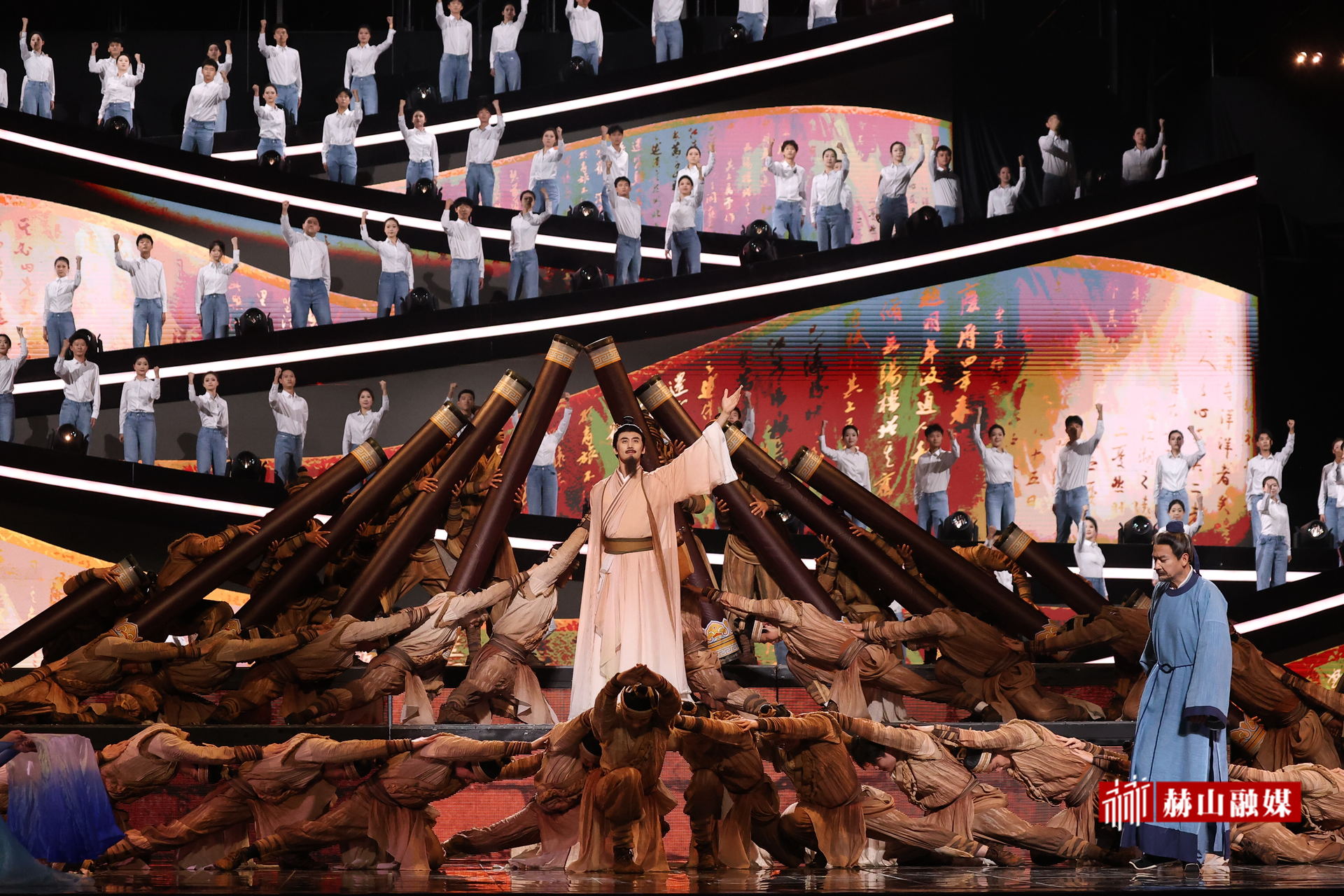 当科技邂逅历史,岳阳的往昔与今朝在舞台上交相辉映。戏剧短片《求记》中,滕子京致信范仲淹为岳阳楼作记。大型情景舞蹈《岳阳天下楼》中,舞者黄琛迪等用灵动舞姿与高难度武术动作,融合虚拟技术与大屏幕视觉呈现六个不同朝代的岳阳楼。戏剧短片《一梦千年》对话古今,吴泽林饰演的主持人与侯长荣饰演的范仲淹打卡当下岳阳,岳阳的历史变迁与蓬勃发展尽收眼底。