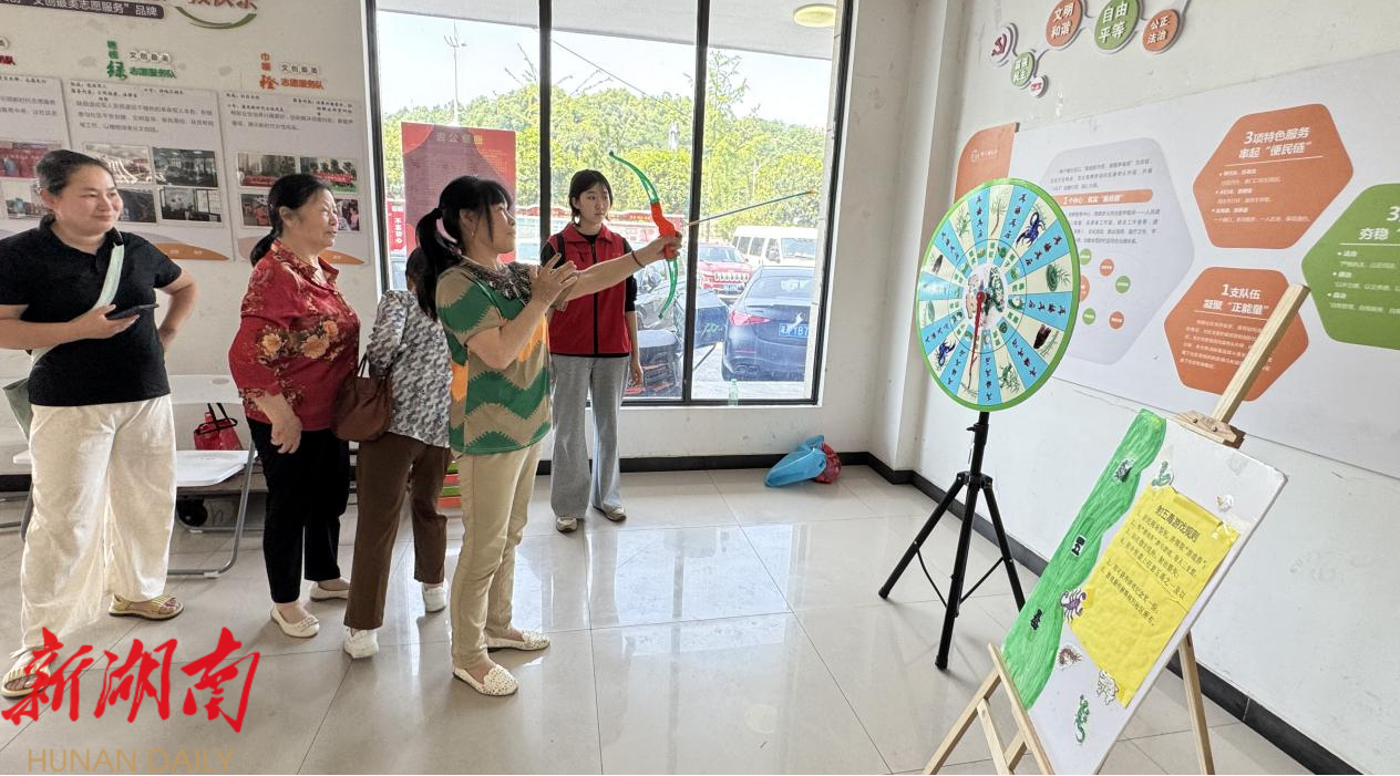 为增强年轻群体参与感,活动创新设置“射五毒”游戏区,采用安全软磁飞镖替代传统弓箭,吸引不少亲子家庭排队体验。活动现场同时布置了端午民俗知识展板,志愿者结合拆迁居民的生活变化,讲解“悬艾草”“佩香囊”等习俗的现代意义,引导居民在变迁中守护文化根脉。