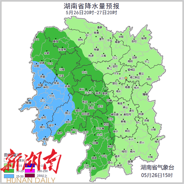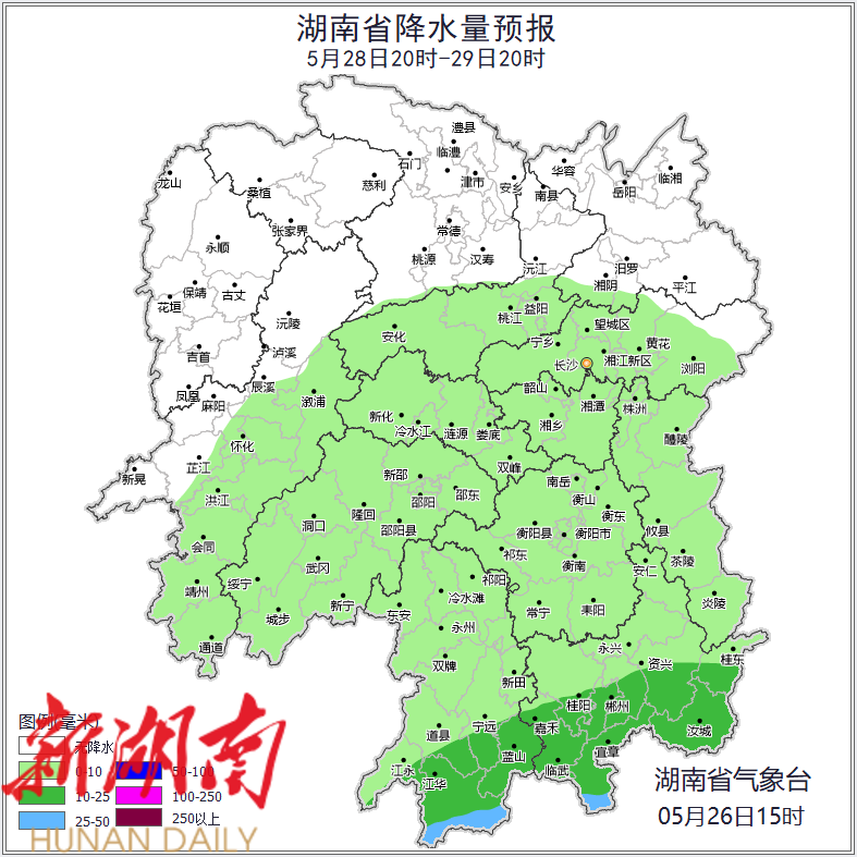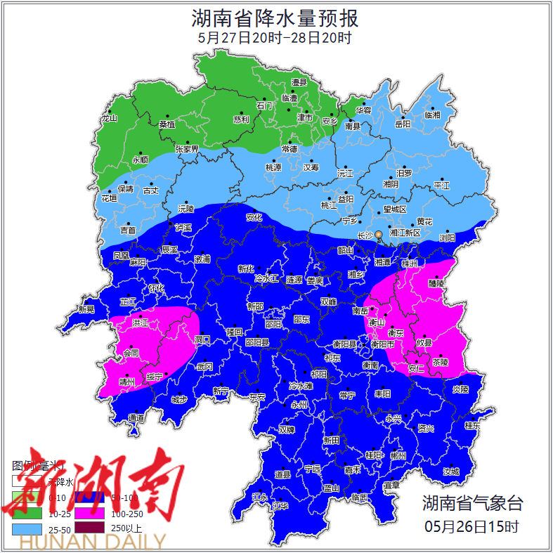 省应急委办公室发布的蓝色汛情提醒显示,5月27日,怀化、湘西土家族苗族自治州、邵阳、益阳、湘潭、株洲、娄底、衡阳、永州等地局地有暴雨,怀化、邵阳、益阳、娄底等地局地有大暴雨,最大小时雨强将达50至70毫米。5月28日,湘中、湘南有中到大雨,其中衡阳、株洲、永州、郴州等地部分地区有暴雨,单点有大暴雨。