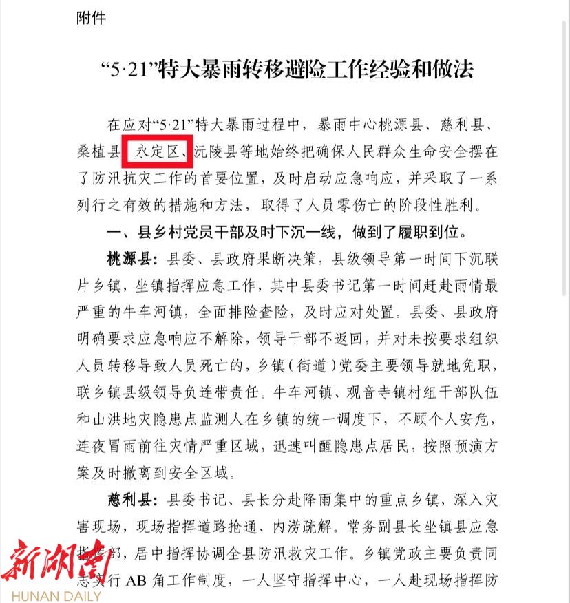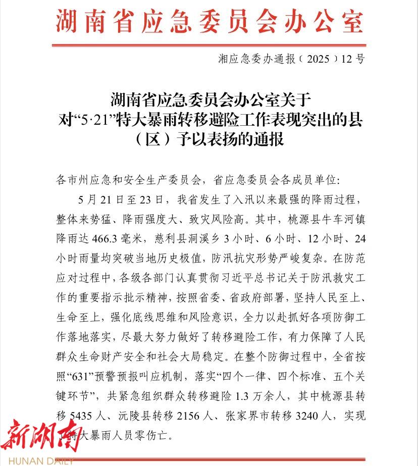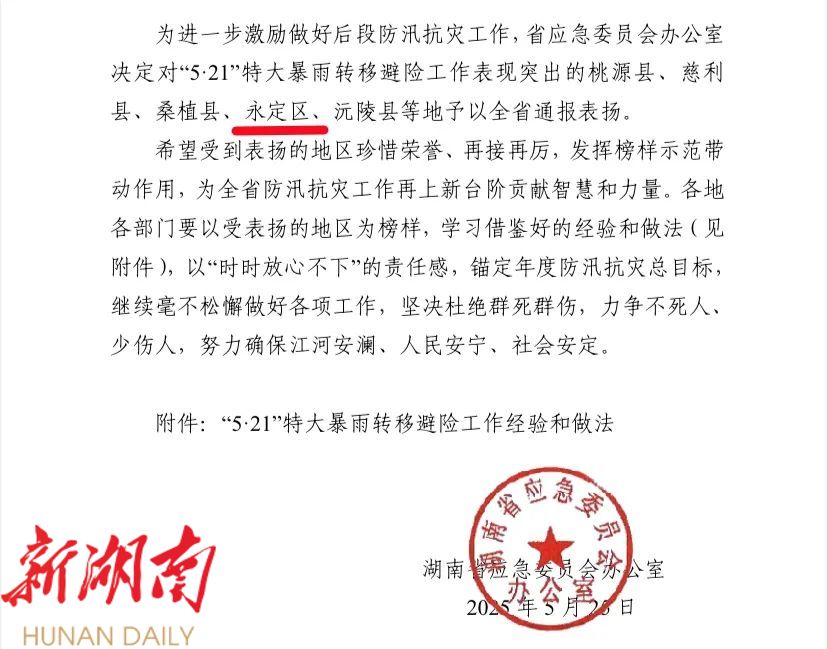 5月25日,湖南省应急委员会办公室发布《湖南省应急委员会办公室关于对“5·21”特大暴雨转移避险工作表现突出的县(区)予以表扬的通报》,决定对“5·21”特大暴雨转移避险工作表现突出的永定区等地予以全省通报表扬。