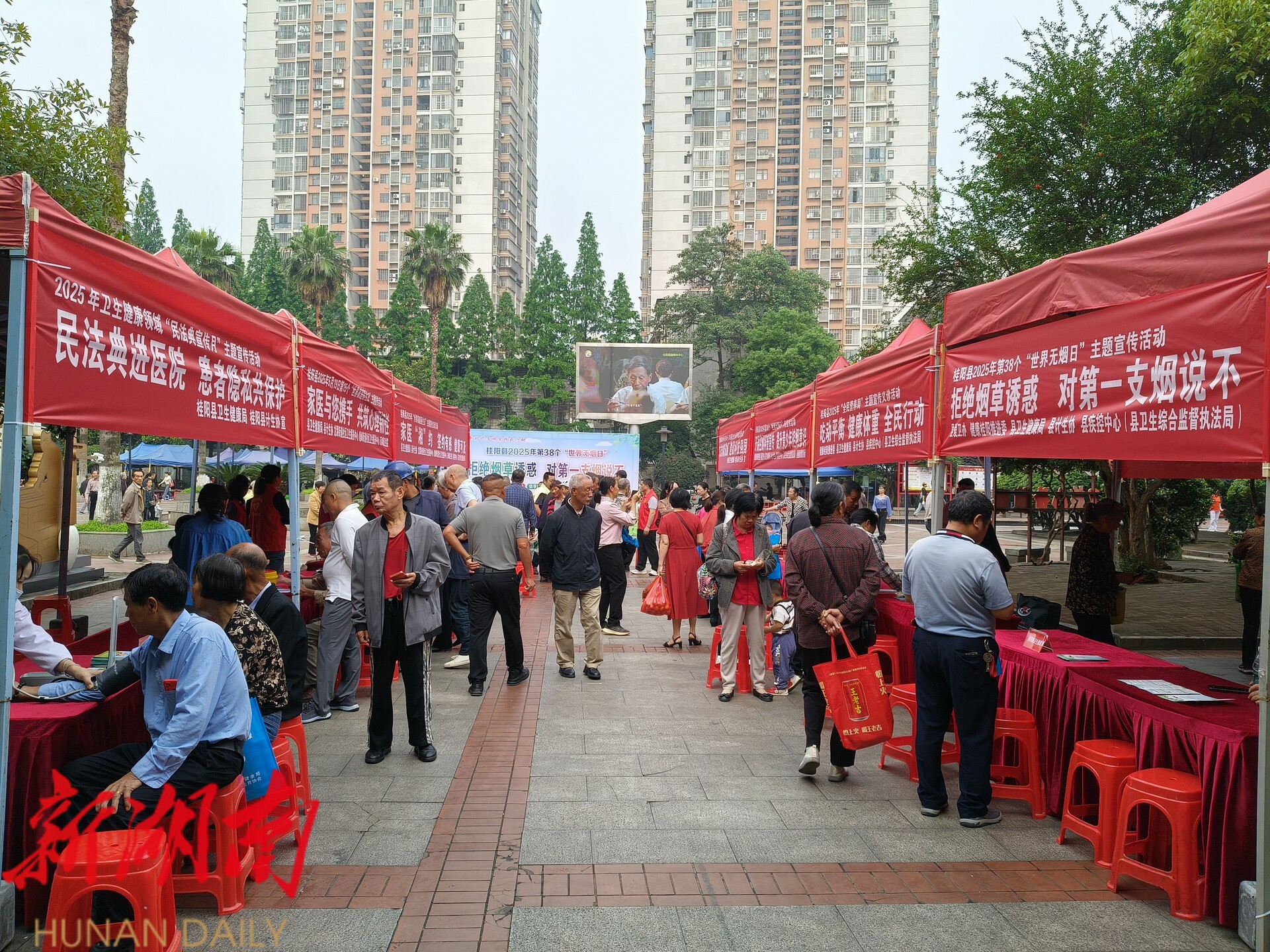 工作人员精心布置宣传展区,悬挂醒目的宣传横幅,摆放内容丰富的展板, 向市民发放健康知识宣传资料,宣传“吸烟有害健康、戒烟有益健康”,提出“烟头不落地、桂阳更美丽”倡议;医护人员热情地为市民测量血压、检测血糖,并提供科学戒烟方法等咨询服务。