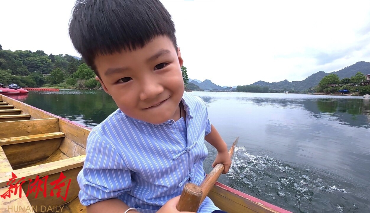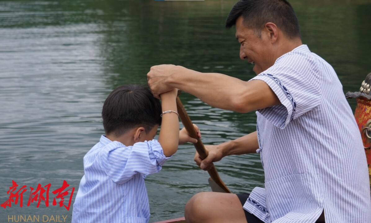45岁的罗尚喜带着3岁儿子罗瑄麟体验亲子训练。“手腕要放松,对,就这样......”罗尚喜轻声指导着,眼神中满是温柔。这位父亲是古丈县红石林龙舟队的骨干队员,此刻却甘当儿子的“专属教练”。