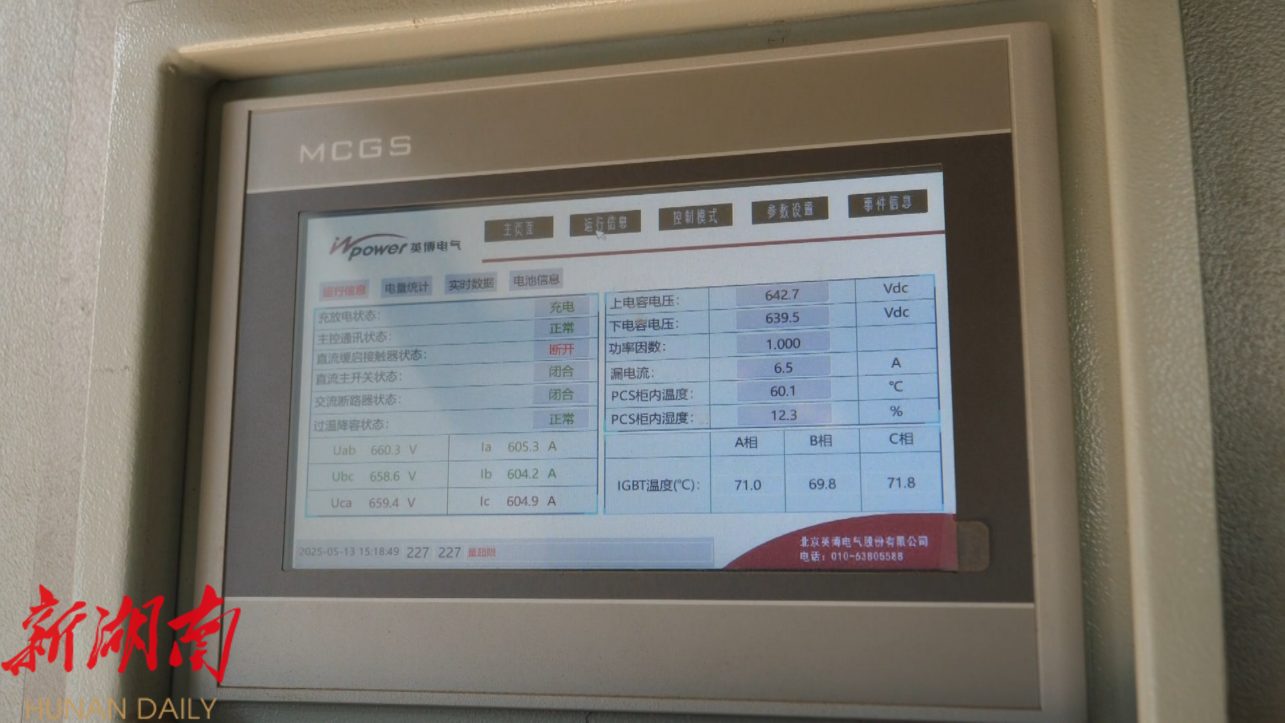 在储能电站项目区域,两排蓝色储能仓整齐伫立,十分引人注目,这是我省首个应用于水泥企业的储能电站项目,通过采用“两充两放”充放电策略,扮演着“充电宝”的角色,在电力低谷时段充电、用电高峰时段放电,利用削峰填谷、优化用电方式助力企业降本增效。葛洲坝石门特种水泥有限公司生产部电气技能专家李杰说:“ 每日可充电电量超16000kWh,可放电电量超14400kWh,充放电转换效率约90%。自2023年4月投运至今,已合计充电电量约531.5万度、放电电量约466.7万度,电站运营收益约458.5万元。”