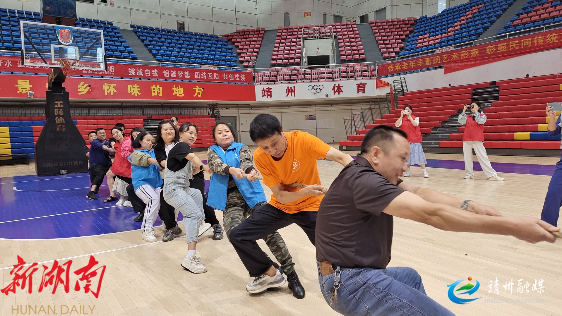 在县民族体育馆内,一场拔河比赛正在热闹上演。社区居民、志愿者们分组展开激烈角逐,只见大家拉紧绳索、站稳马步,拼尽全力将绳索往己方拉动。一旁的加油声 此起彼伏,助威声一浪高过一浪。