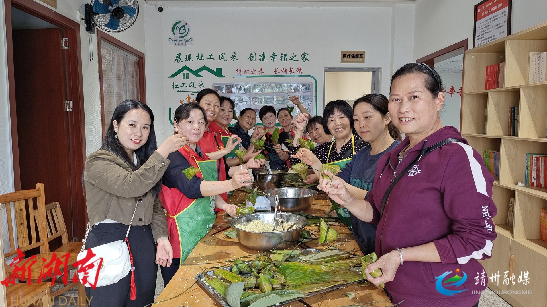 在飞山社区养老日间照料中心, 包粽子环节同样人气高涨,志愿者与居民们围坐在一起,熟练捋粽叶、填糯米、扎捆,一只只饱满粽子快速成型,洋溢浓浓节日氛围。