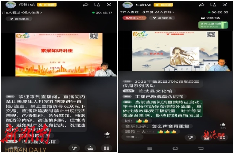 截至目前,临武县文化馆共计收到市民自发拍摄的“我与文化馆”短视频4个,组织开展送文艺下乡演出5场次、非遗和艺术展览5场次,举办线上线下艺术公开课8场次,吸引了2万余人次观看演出、展览和参训,真正做到了让文化贴近大众。