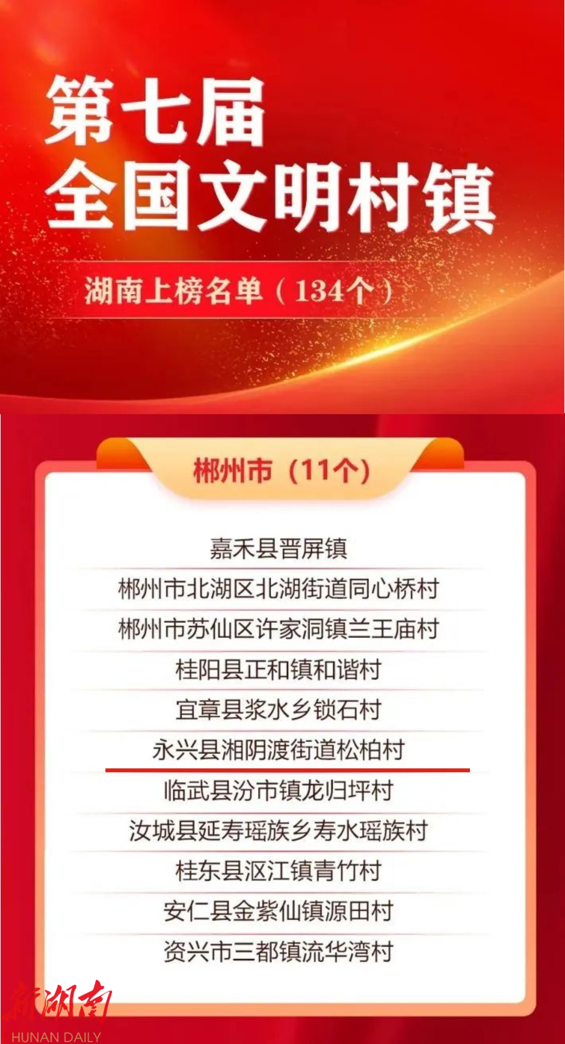 湖南日报·新湖南客户端5月28日讯(通讯员 戴儒舟 熊雅静)近日,在全国精神文明建设表彰大会上,永兴县松柏村脱颖而出,荣获“全国文明村镇”称号,为湖南乡村振兴示范建设再添亮色。