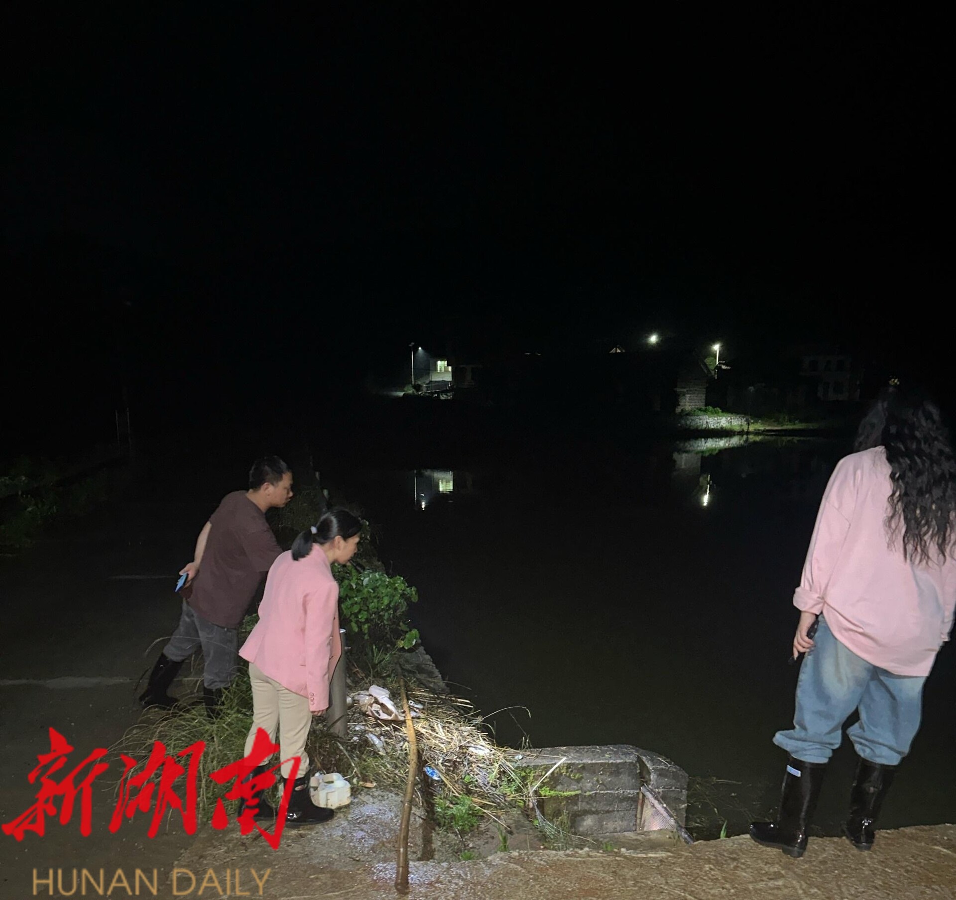 (图为5月27日晚 街道干部到阳王村查看山塘情况)
