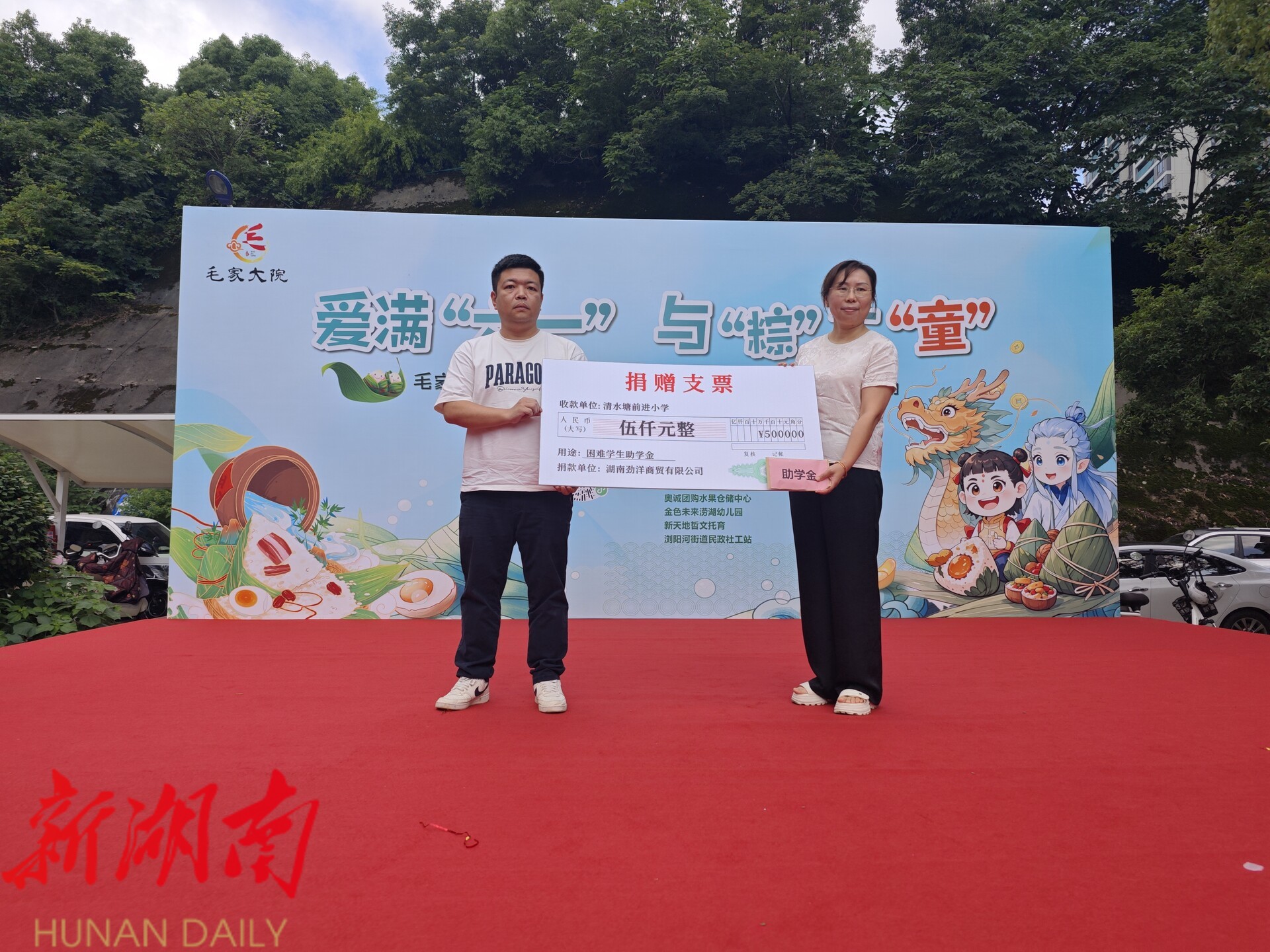 活动在幼儿园小朋友《中华美少年》啦啦操的青春律动中拉开序幕。劲洋酒业现场向清水塘前进小学捐赠价值5000元的助学金,企业负责人表示:“我们希望通过持续的教育帮扶,让每个孩子都能共享阳光成长的机会。”毛家垅社区党委书记戴燚红亲自为两家幼儿园送去慰问礼包,将关爱化作孩子们手中的文具与玩具。
