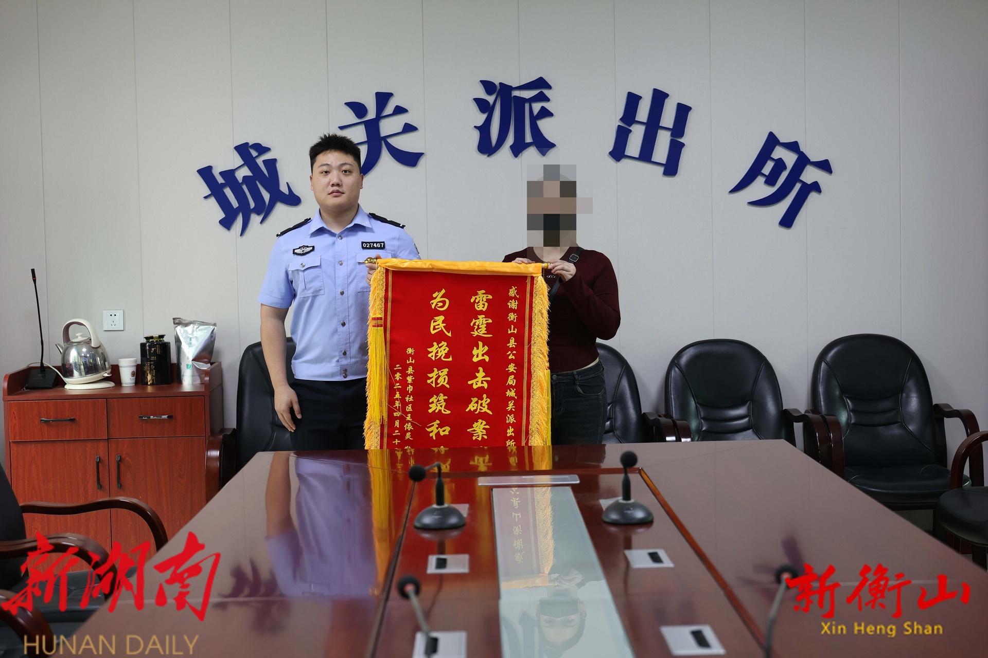 (王女士向衡山县公安局城关派出所民警送上一面锦旗)