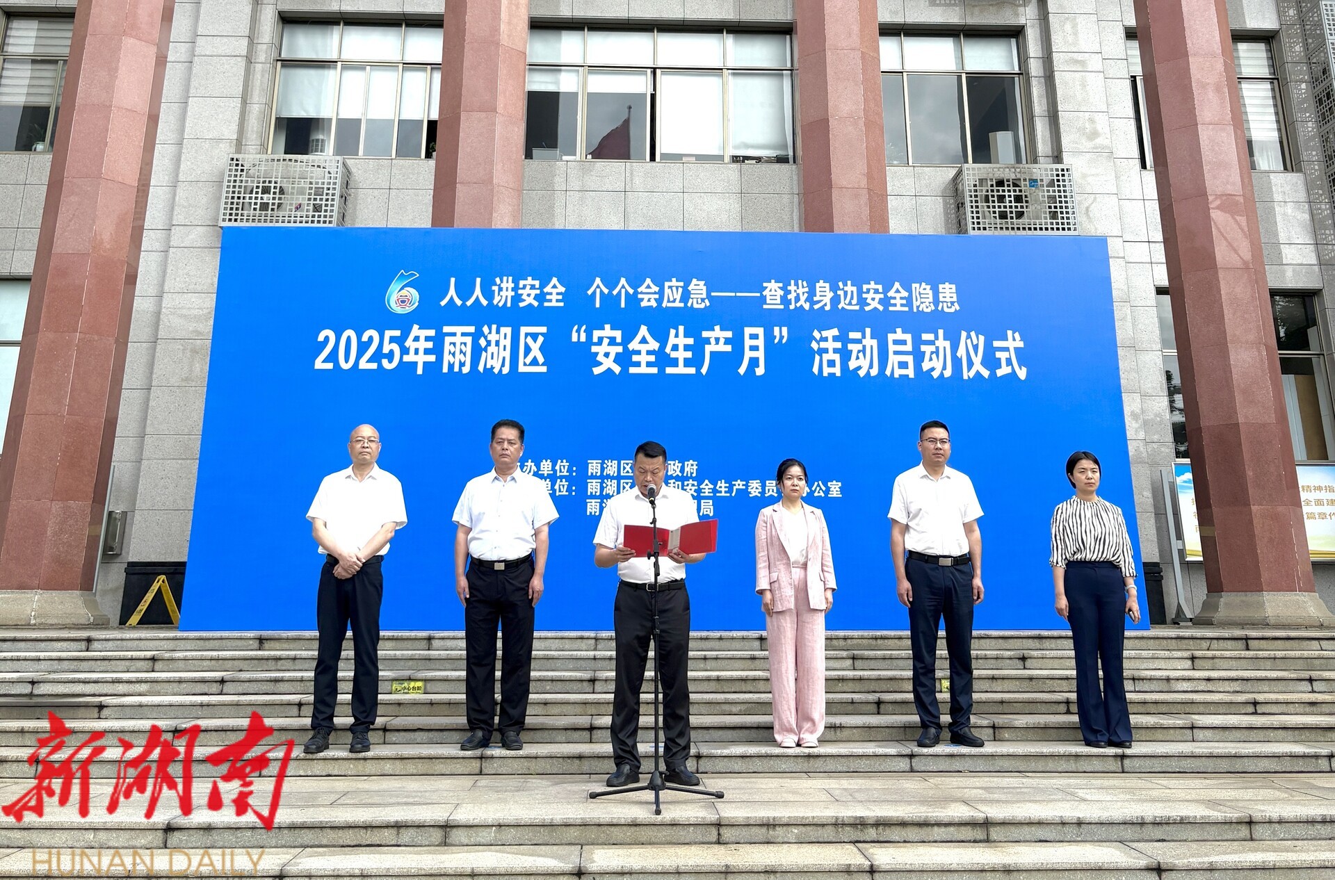 今年“安全生产月”的主题是“人人讲安全、个个会应急——查找身边安全隐患”,这是坚持安全第一、预防为主,推动公共安全治理模式向事前预防转型的重要举措。雨湖区将以启动仪式为契机,办好一年一度的“安全生产月”活动,争取把每月都办成“安全生产月”,紧绷安全之弦,以高水平安全为高质量发展保驾护航。