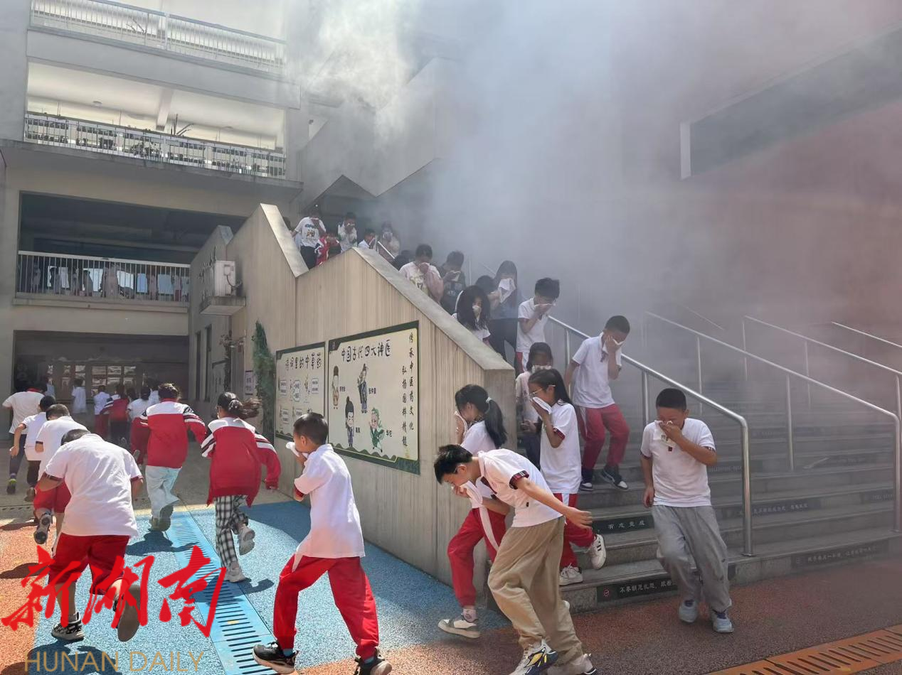 在老师、安全员以及提前部署到位的消防指战员的指挥引导下,全体学生迅速进入应急状态,严格按照日常安全教育的要点,用毛巾捂住口鼻,压低身体重心,沿着预定的疏散通道,快速、有序地向学校操场进行撤离。整个过程紧张而不慌乱,紧凑而有序。在三分钟内,各小学的所有师生全部安全、顺利地撤离至指定安全区域集结。