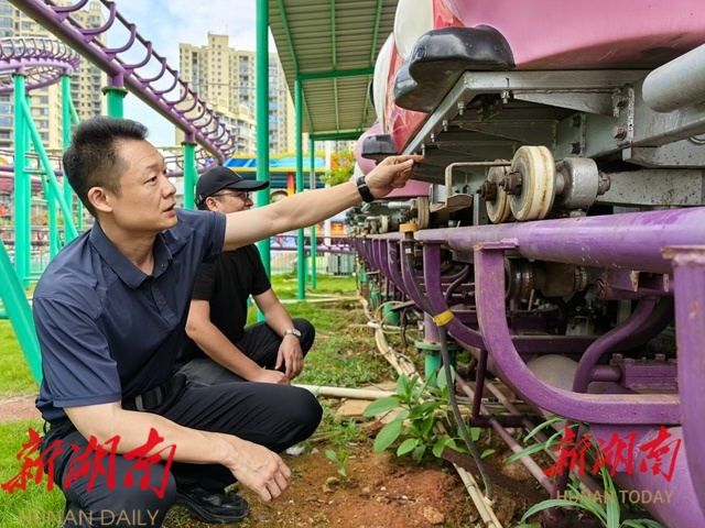 (彭韬在龙王池游乐园督导安全生产,察看游乐设施运行及维护情况)