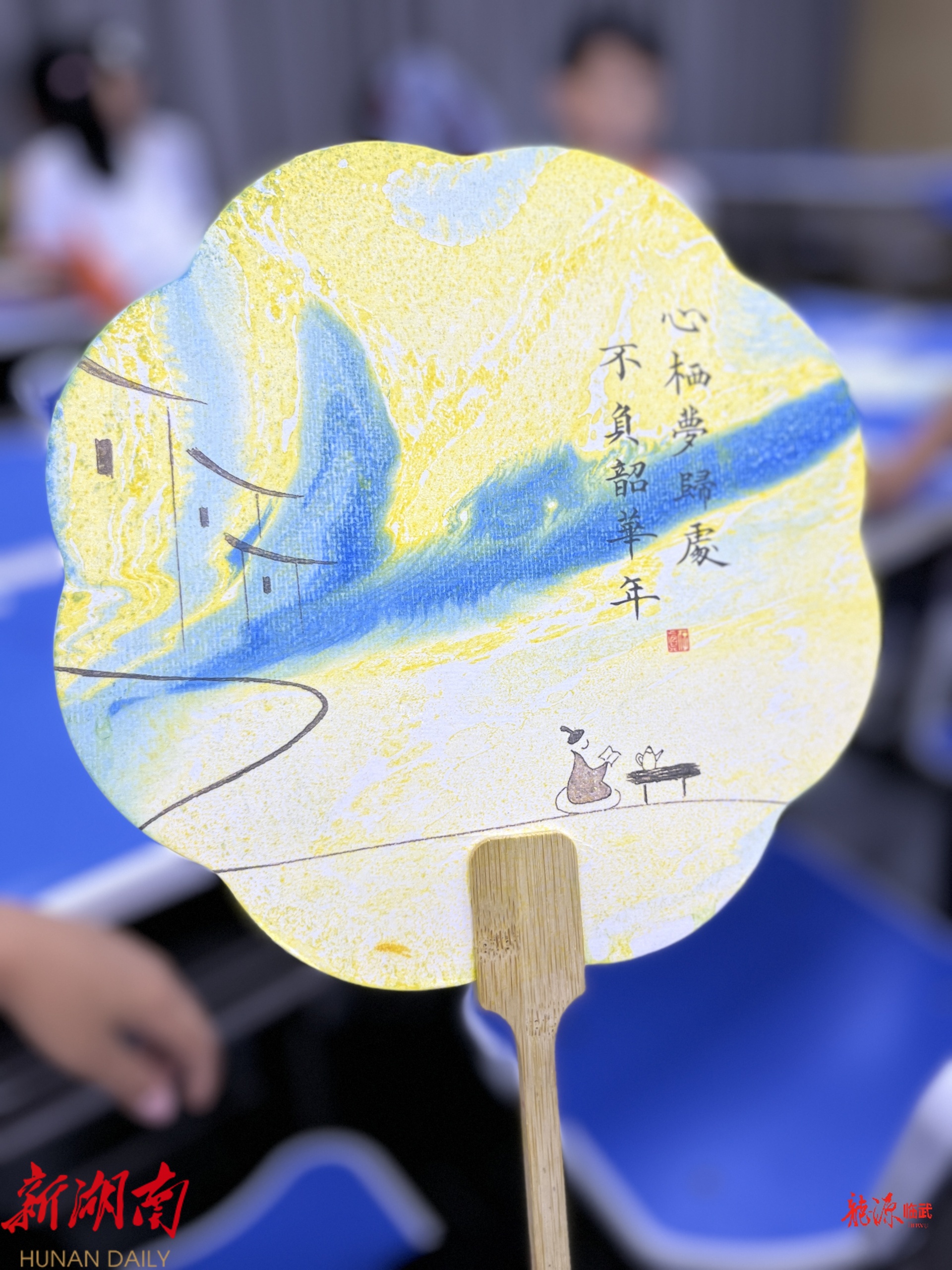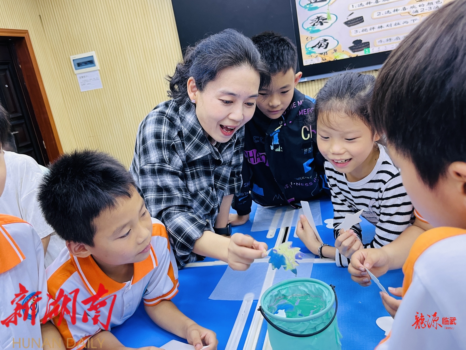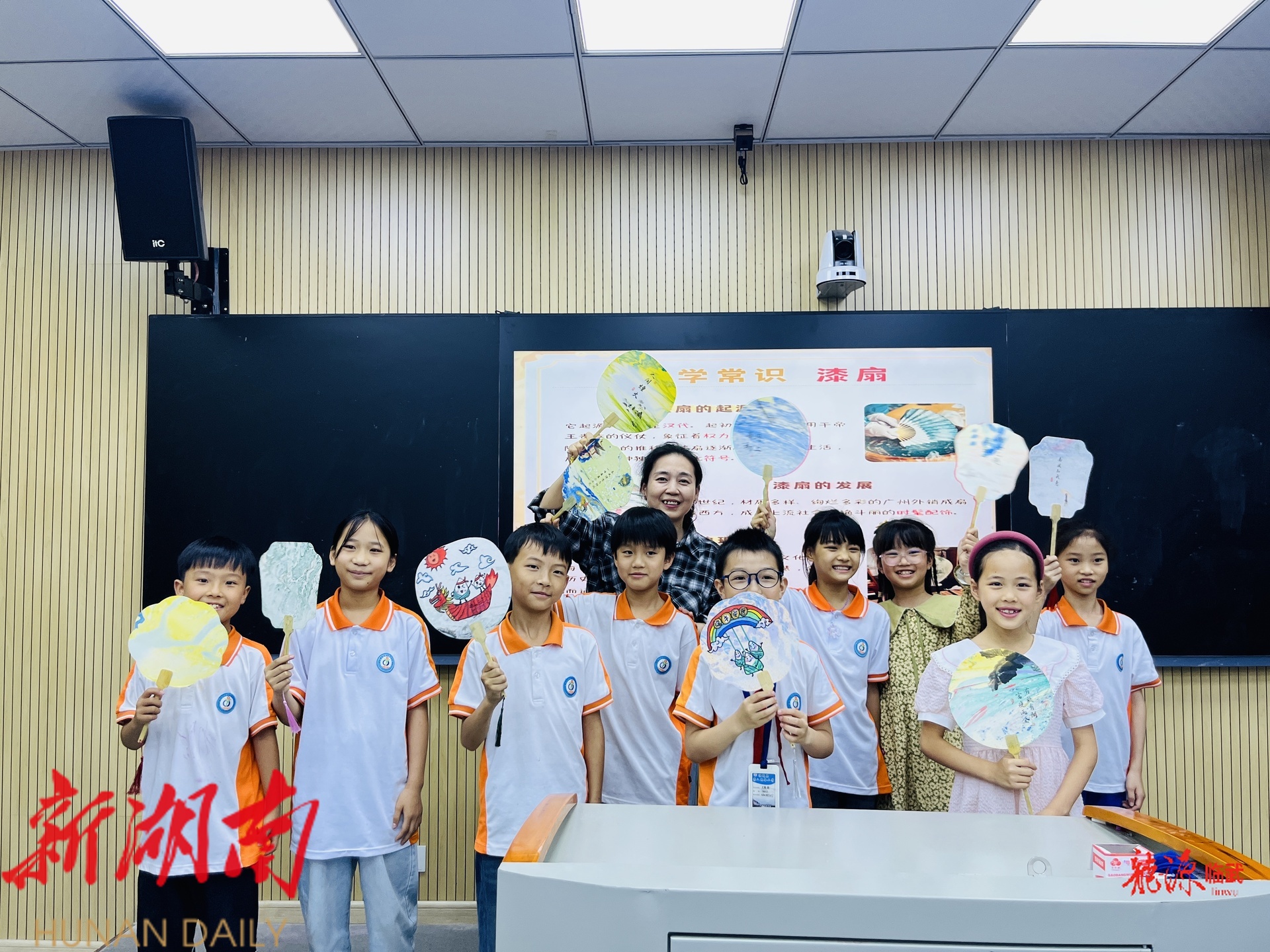 5月29日,在临武县八完小2203班的教室里,一堂别开生面的非遗体验课正热闹上演。老师化身“非遗导师”,娓娓道来 漆扇的千年历史,现场展示“水影成画” 绝技 ——滴漆入水、轻搅成纹、素扇浸入……一幅天然晕染的图案跃然扇面。孩子们目不转睛惊叹连连,迫不及待化身“小小传承人”,亲手调配色彩、搅动水面、浸染扇面,感受“一半人为,一半天成”的东方美学,创造出独一无二的非遗艺术作品。