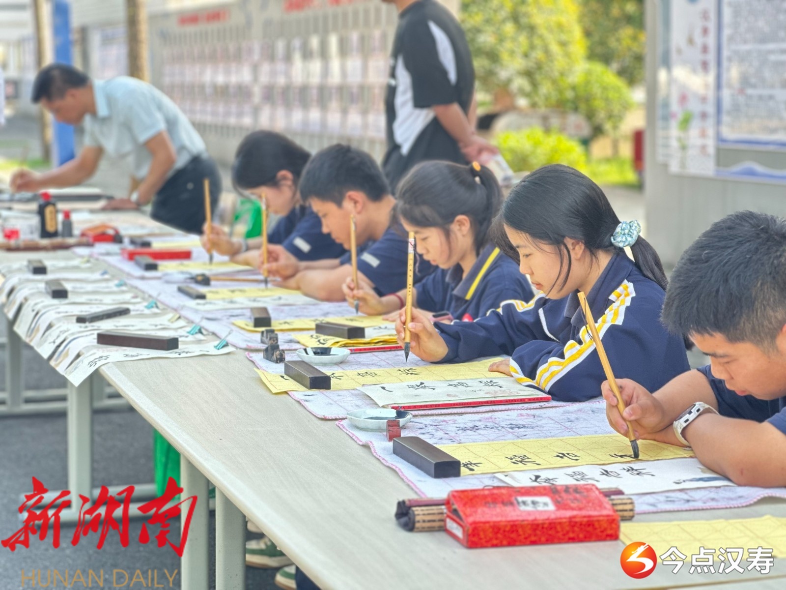 与此同时,书法社团的师生在校道现场创作,隶书的端庄、行书的洒脱跃然纸上,“端午安康”“一举高粽”等作品吸引众多师生驻足欣赏,墨香与诗韵交织成校园里的文化风景线。