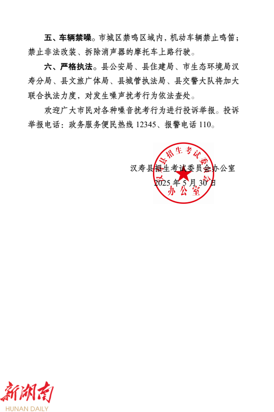 六、 严格执法。 县公安局、县住建局、市生态环境局汉寿分局、县文旅广体局、县城管执法局、县交警大队 将加大联合执法力度,对发生噪声扰考行为依法查处。 欢迎广大市民对各种噪音扰考行为进行投诉举报。投诉举报电话:政务服务便民热线 12345、报警电话110。
