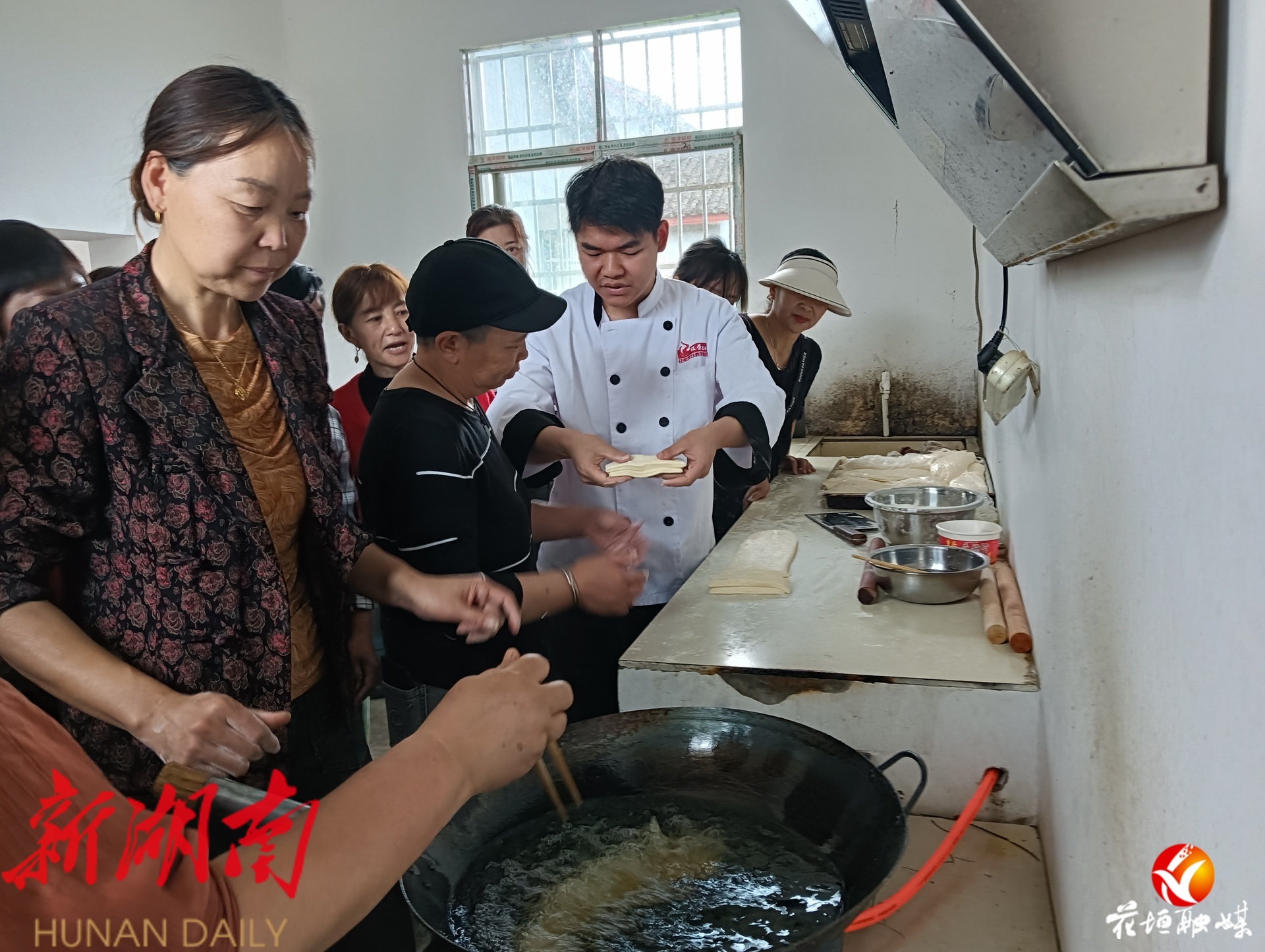 “我来试试!”活动现场,大家踊跃参与。朗诵环节结束后,村民在专业师傅指导下学习炸油条技巧。村部前,粽叶、糯米等材料早已准备就绪。随后,干部与村民共同进入包粽子环节。