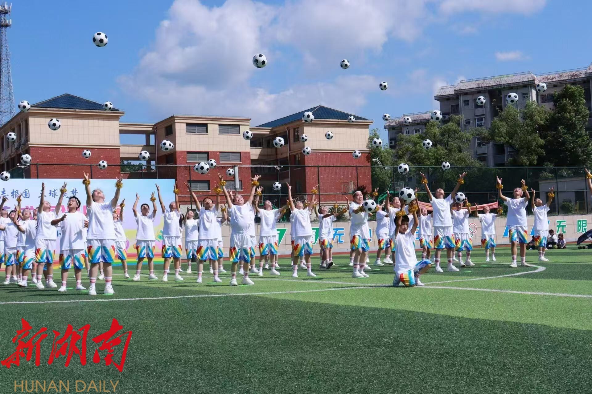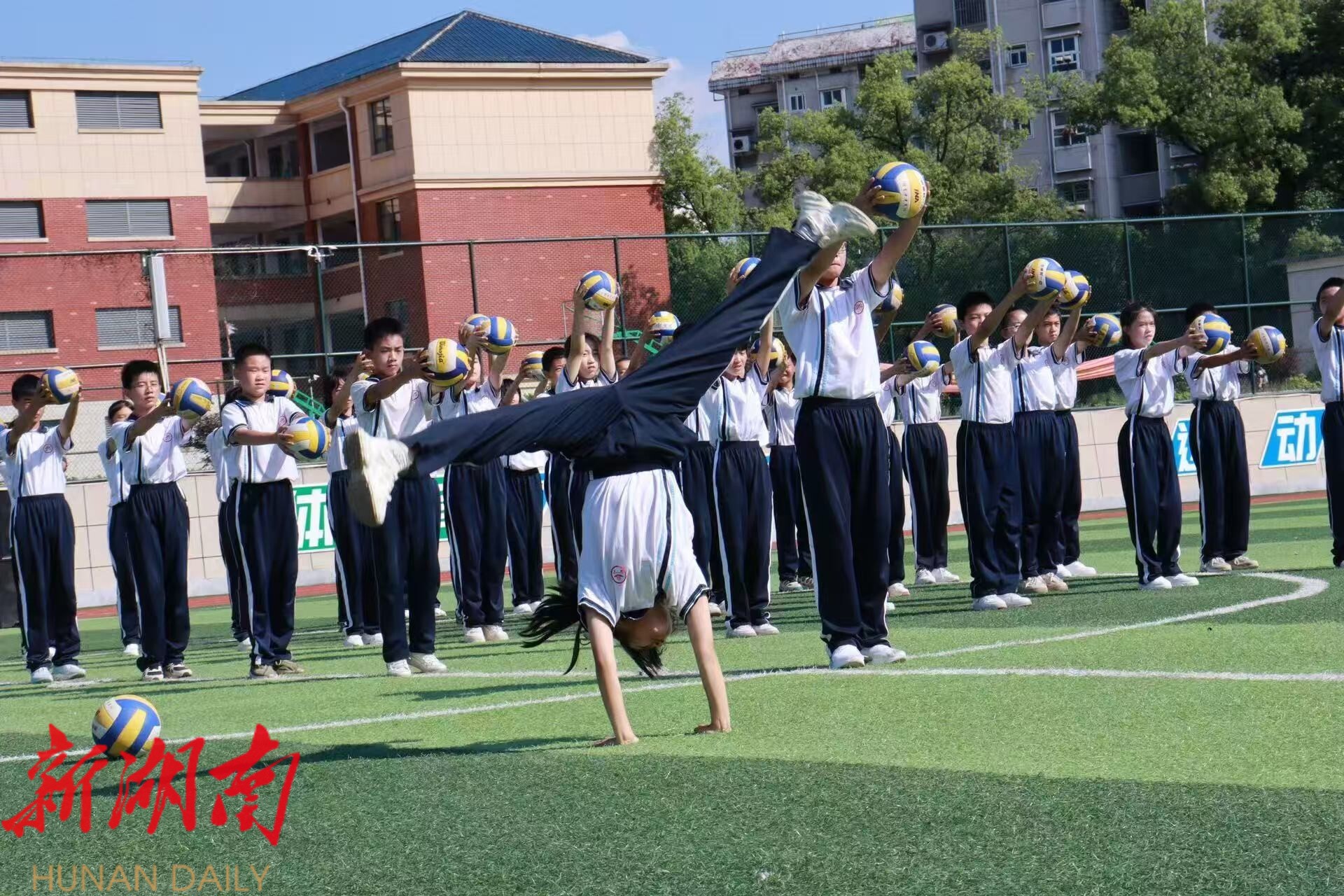 紧接着,学校各个班级分别带来了足球、篮球和排球表演。
