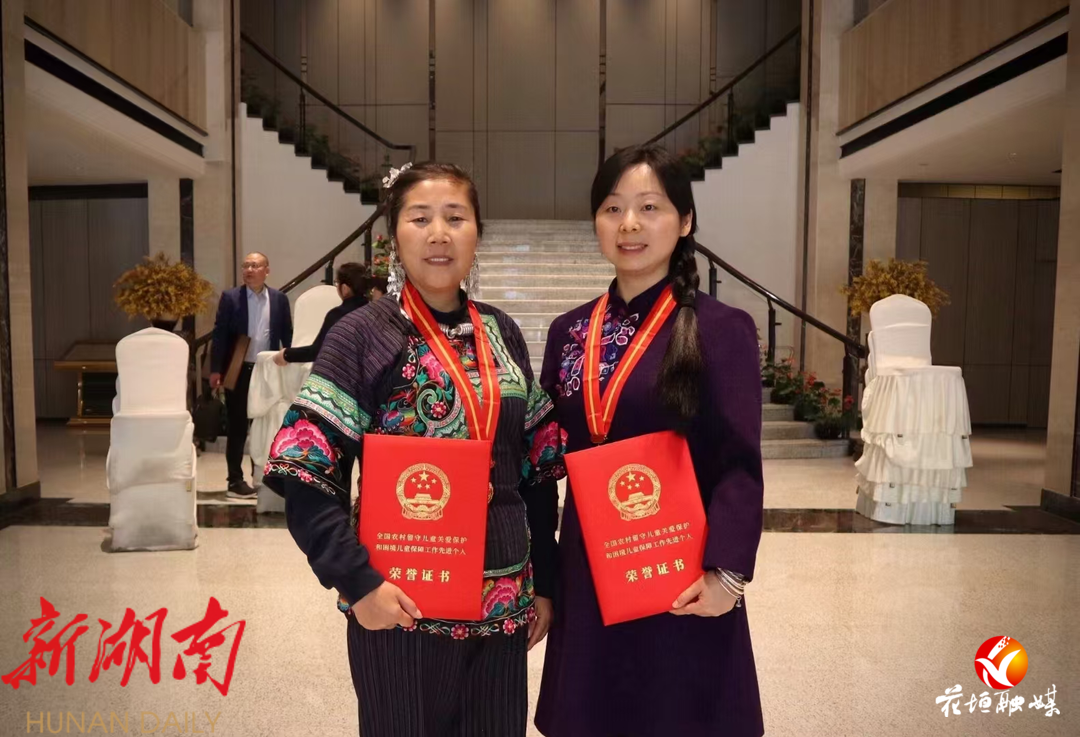 ▲田金珍(左一)荣获全国农村留守儿童关爱保护和困境儿童保障工作先进个人(图源 花垣融媒)