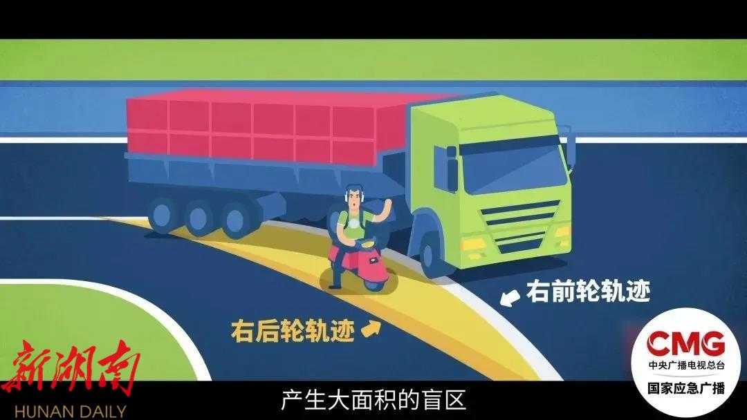 大型车辆转弯时,前、后车轮的运动轨迹不重合,会呈现出弯月形状的盲区 。若此时处在这一区域,极易被撞倒卷入车底,发生碾轧事故。