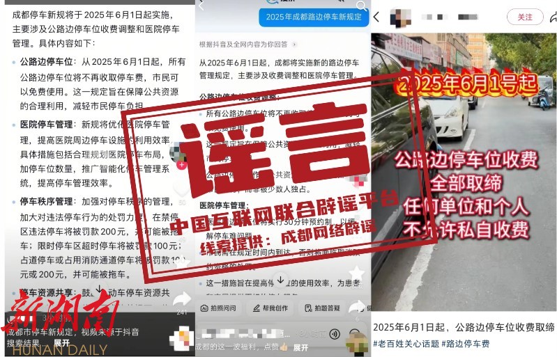 真相: 近日,个别网民在网络平台发布信息称,“成都市停车新规定,从2025年6月1日起,所有公路边停车位将不再收取停车费,市民可以免费使用”,引发关注。对此,微信公众号“成都停车App”发布声明称,网传“成都市所有公路边车位将不再收取停车费用”“6月1日起成都路边停车位0元”系不实信息,暂未收到上级单位停止收费的通知。成都市中心城区临时占道停车场是按照《四川省〈中华人民共和国道路交通安全法〉实施办法》的相关规定,由成都市公安交管部门统一规划、设置。收费标准按照成都市发改委《关于调整城区机动车临时占道停放差别化收费标准的通知》(成发改收费〔2011〕1334号)文件执行。(来源:“成都网络辟谣”微信公众号)