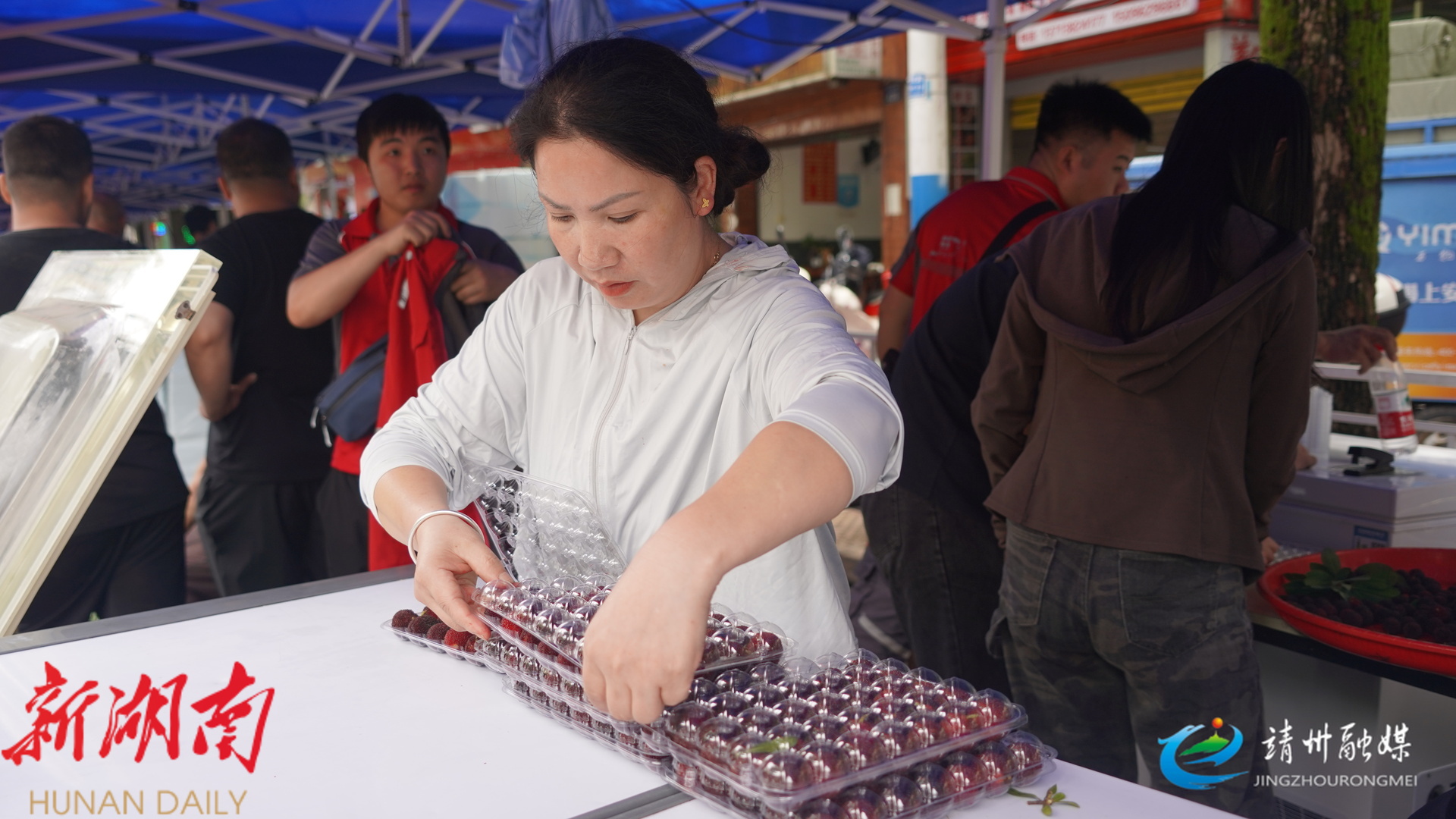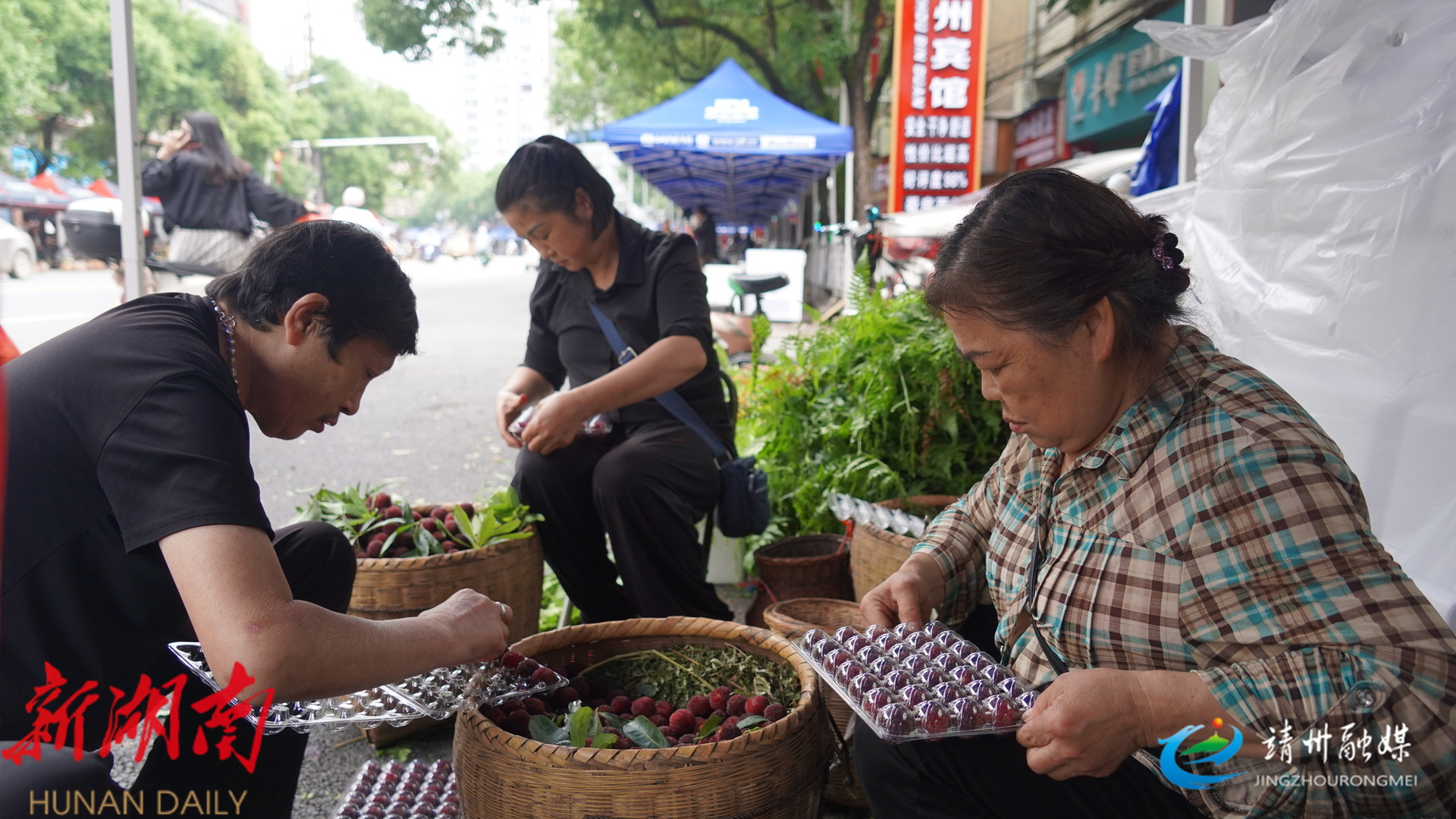 在飞山北路的杨梅临时销售市场,快递揽收点标识醒目,工作人员正有条不紊地布置工作台、搬运打包箱。果农们卸下刚采摘的杨梅,商客们挑选、称重、议价后,即可在就近的快递点完成打包发运。