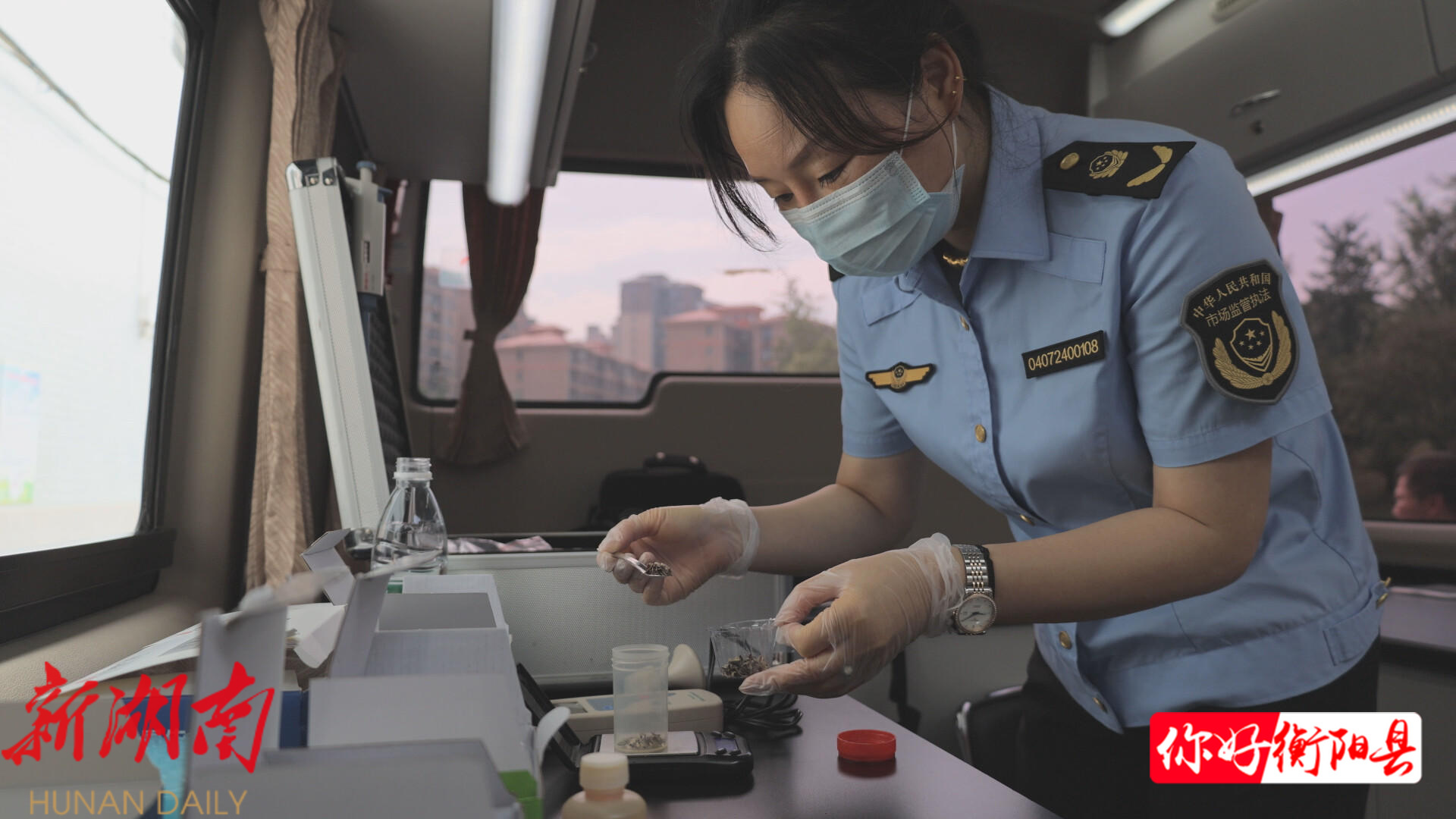 在县三中考点,工作人员对食堂新采购的大米、食用油、干制品等进行随机采样,再回到食品安全快速检验车上,逐一检测食品的新鲜度、酸价和过氧化值、二氧化硫等指标,半个小时以内就能出结果,全部确认合格后才能用于高考期间。