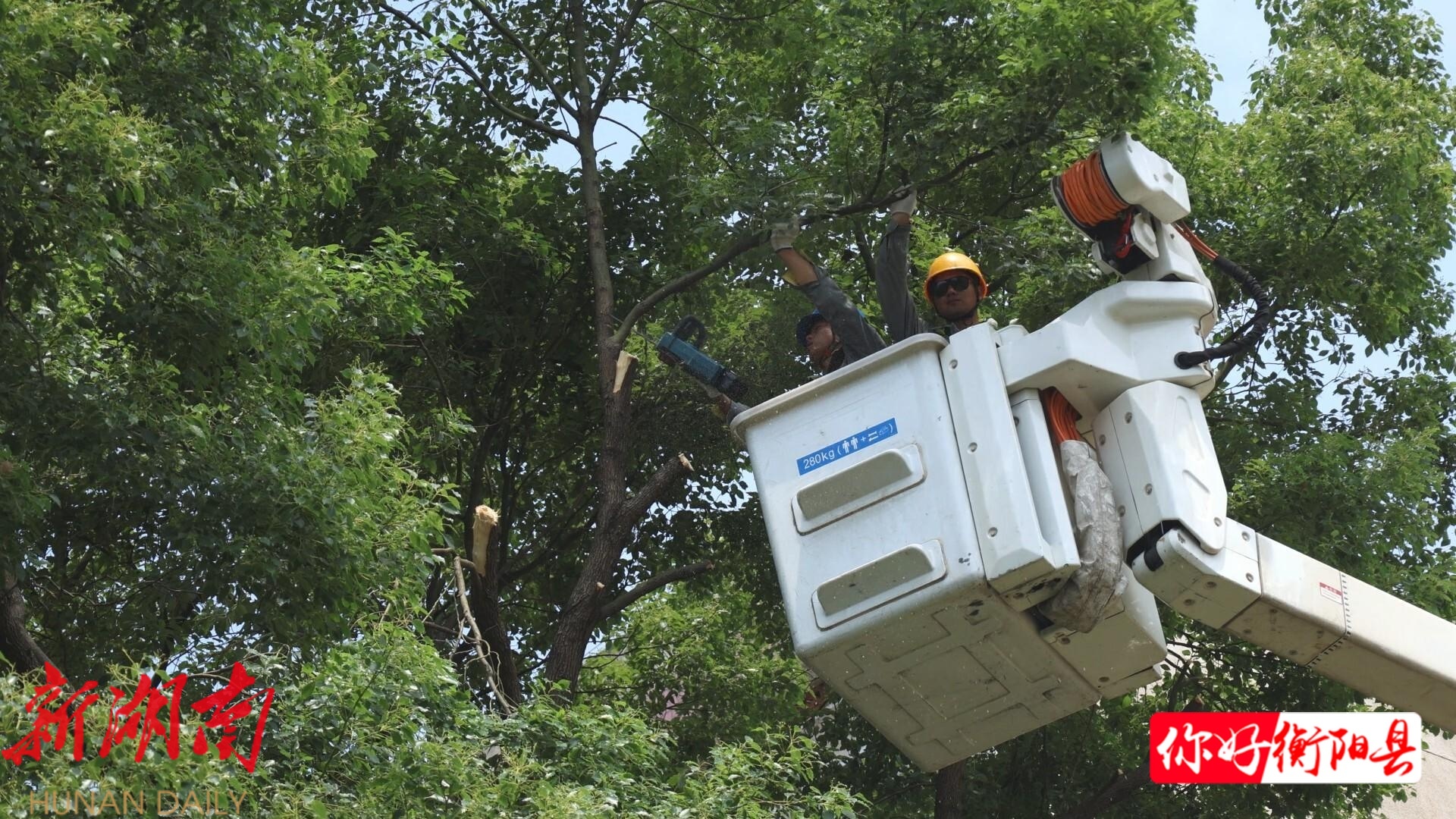 在10千伏胜城A线衡阳县一中附近,国网衡阳县供电公司的电力工人们正使用绝缘斗臂车开展带电作业。6月4日凌晨时分,电力巡查人员发现该线032-3杆引流线发热,温度达62.7度,超过正常阈值,为防止温度持续升高而影响县一中考场用电,国网衡阳县供电公司紧急调派人员与设备进行检修消缺,当天上午十点,作业人员完成引流线更换,复测温度正常。