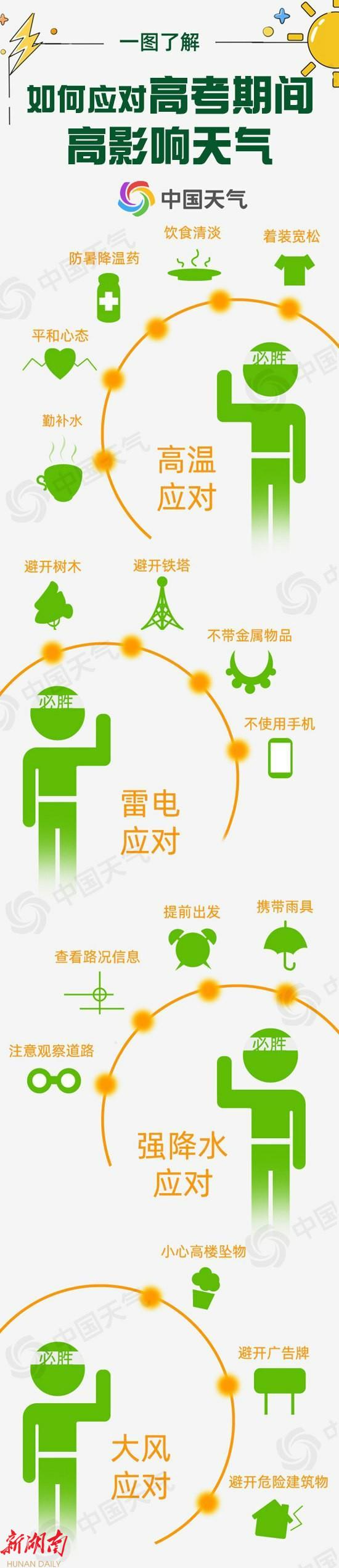 高考期间需防范降雨、雷电和高温天气对高考出行、户外活 动的不利影响。高考相关人员注意及时关注天气变化,提前规划行程, 做好防暑降温准备,城区考点及周边加强交管保障;考点注意应对 8 日下午雷电可能对外语听力考试的影响。