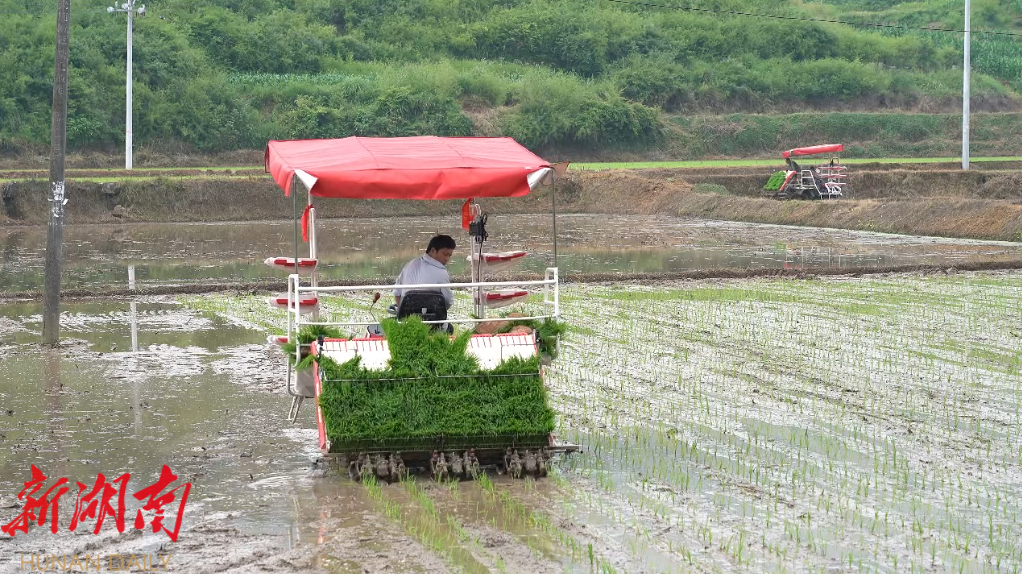 而在不远的稻田里,两台插秧机正来回穿梭,伴随着机器的轰鸣声,一株株秧苗被精准地插入田中,排列得整整齐齐。