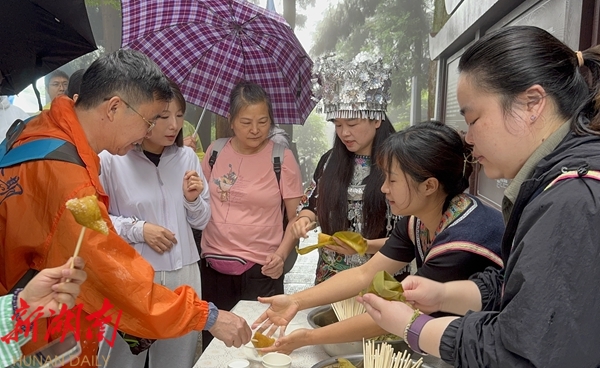 湖南日报·新湖南客户端 5月31日讯(记者 覃蕾)粽叶飘香迎客来!端午假期首日,尽管细雨绵绵,但未能阻挡游客们涌向张家界国家森林公园的热情,当天,景区精心准备“宠客”大招,让游客沉浸于山水与文化交融的节日氛围。