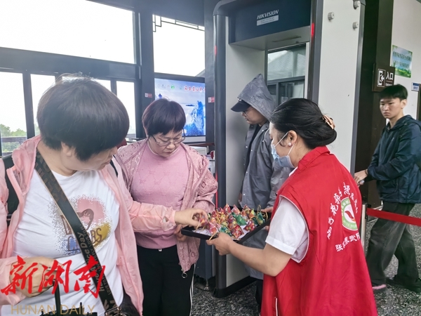 在森林公园门票站,工作人员为游客们递上免费香甜粽子。(张霞 摄)